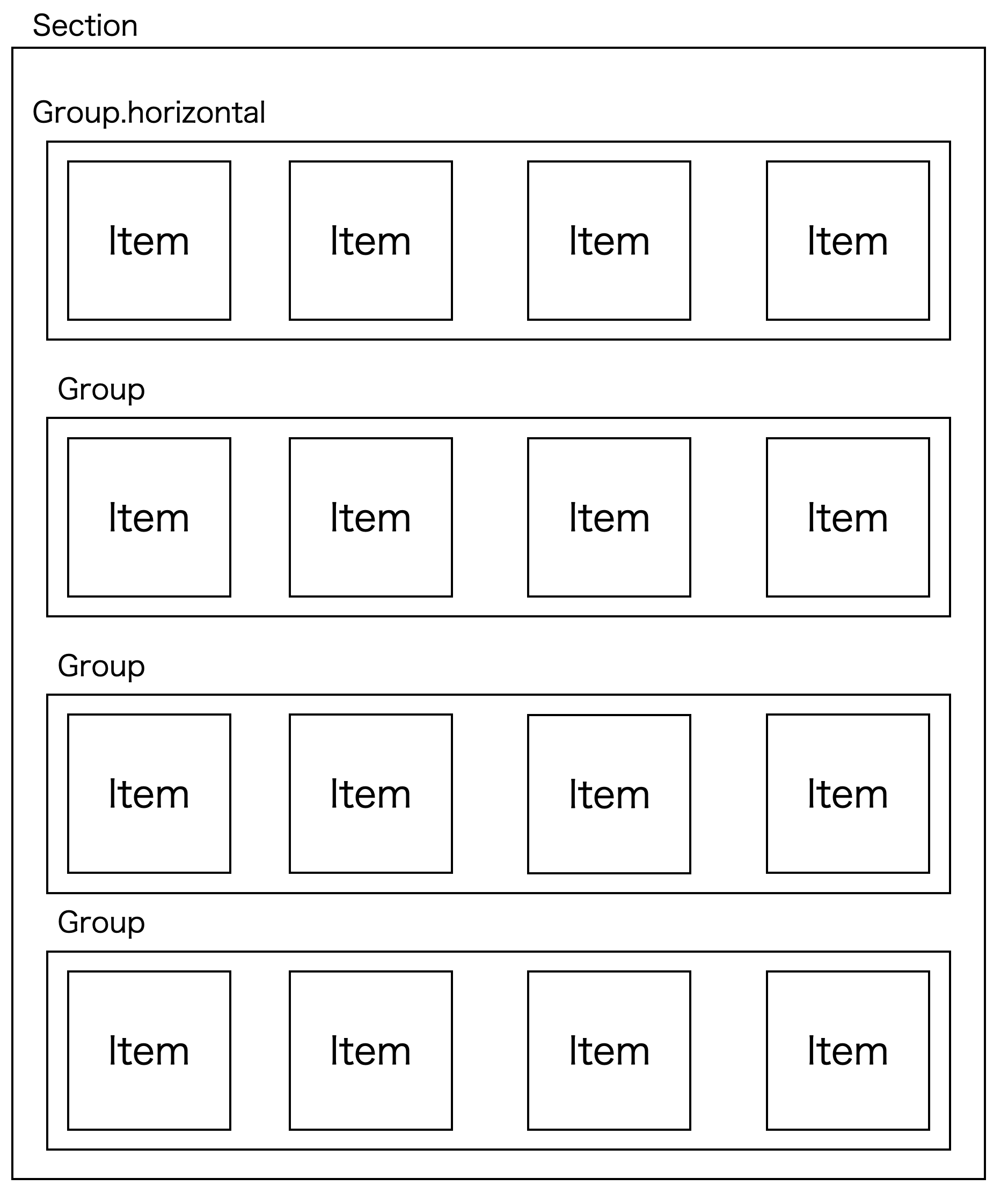 init(section: NSCollectionLayoutSection)- どのSectionでも渡したLayoutSection通りのレイアウトになります