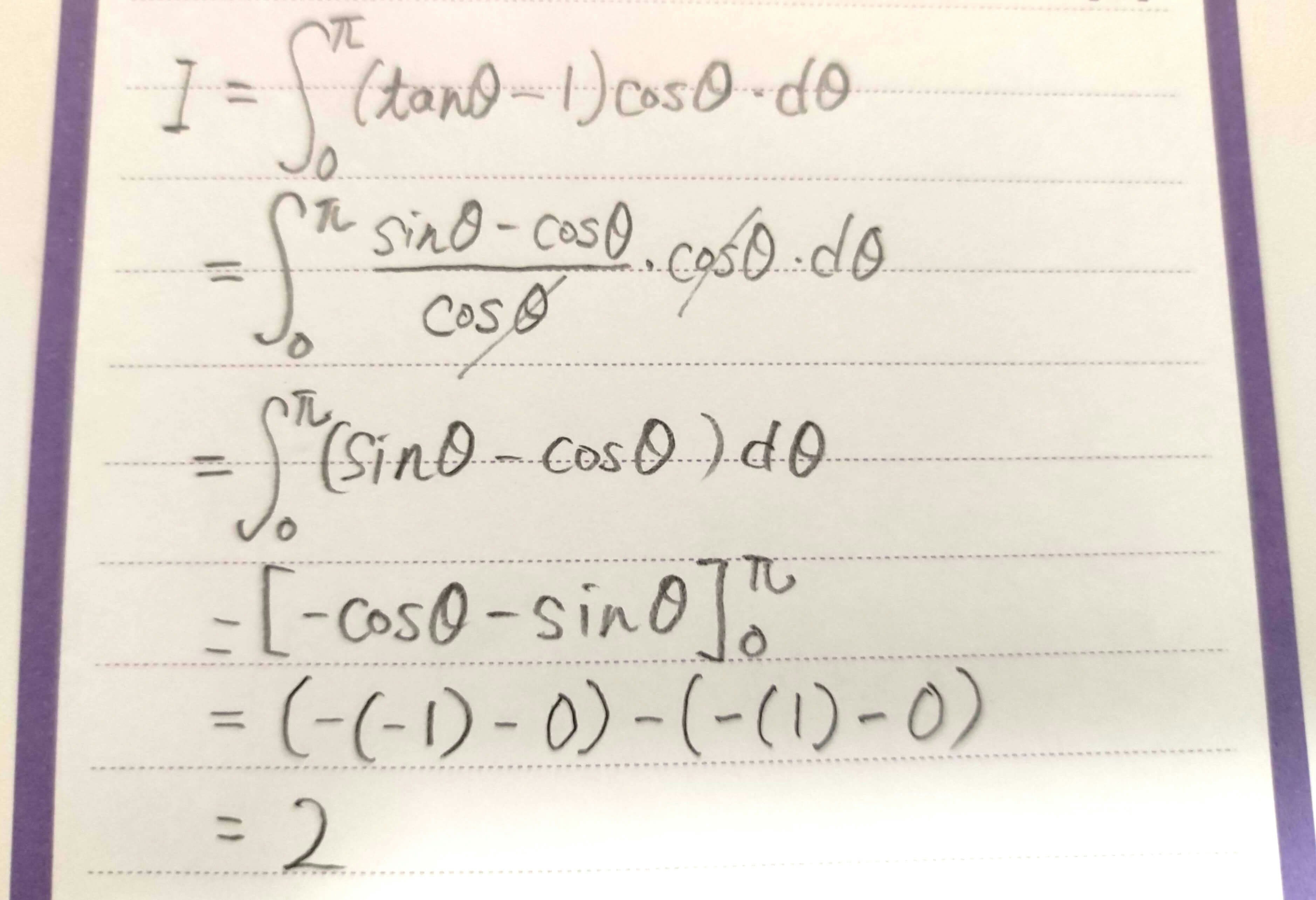 \int_0^\pi (\tan\theta - 1)\cos\theta d\theta