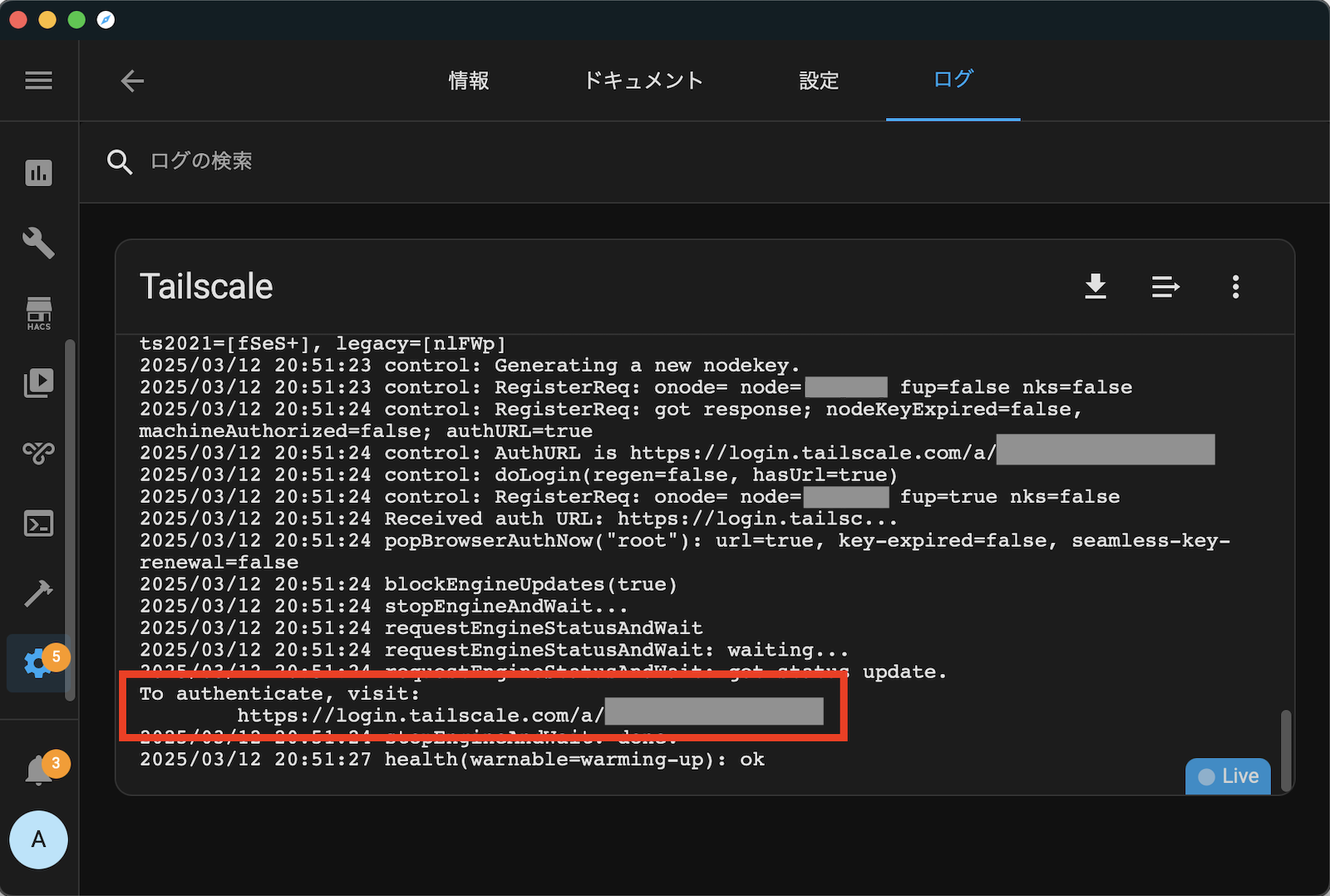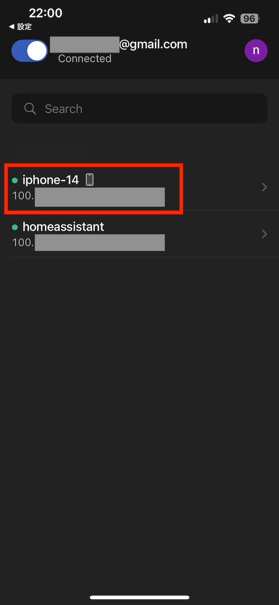 100.xxx.xxx.xxxというIPアドレスがTailscaleネットワーク経由でHomeAssistantにアクセスするIPアドレスになります