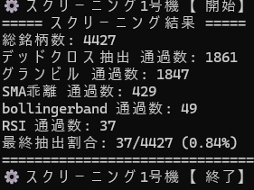SMA乖離率のスクリーニングの際に1/10まで削れて、そこからさらにボリンジャーバンドを通過、残りをRSIで抽出していることから、スクリーニング率はあまり高くないですが、10銘柄ほど削れていることがわかります。