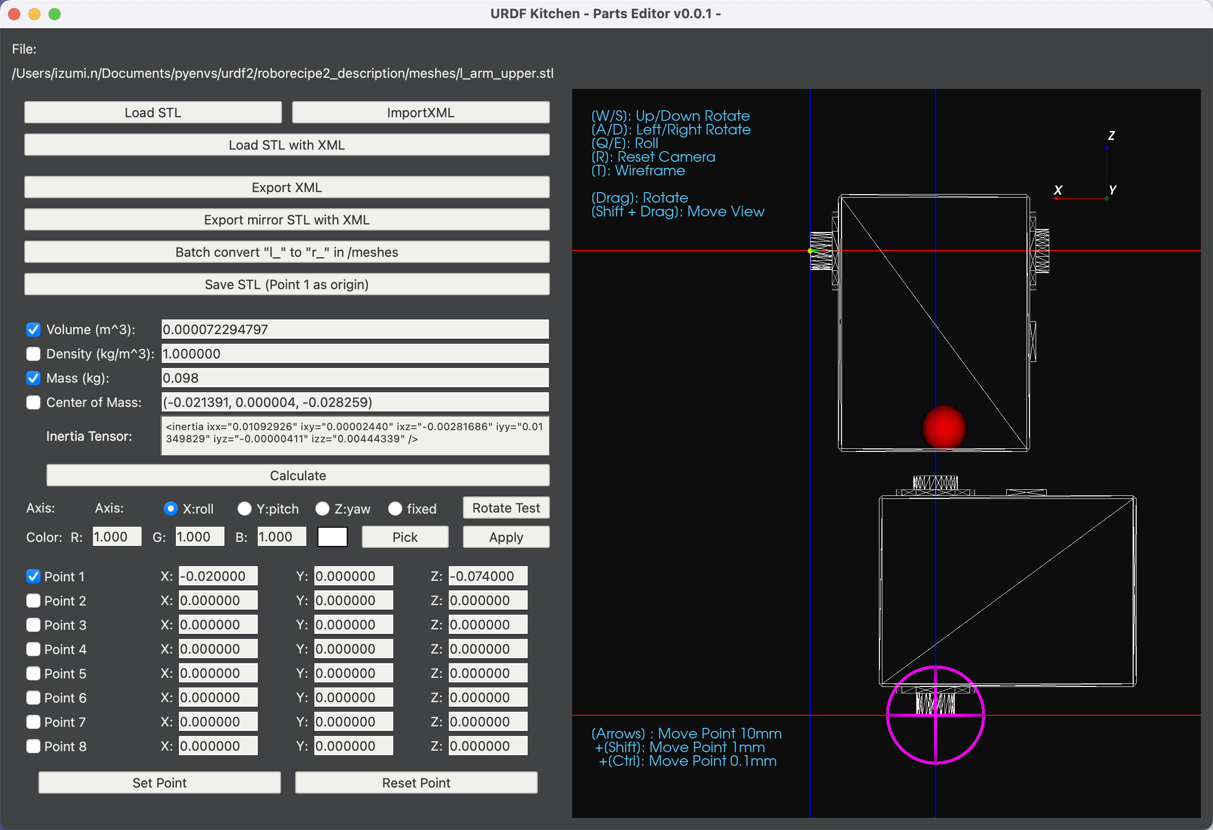 また、ここでパーツの重さを実測して入力しておくことで、イナーシャの計算などもできてしまいます。左側中央にパラメータの入力欄がありますので、値を入れたところ、たとえばMass(kg)にチェックを入れてCalculateボタンを押すと、それに応じた慣性テンソルが計算されます。(※イナーシャの計算方法が間違っていたらご指摘ください。)