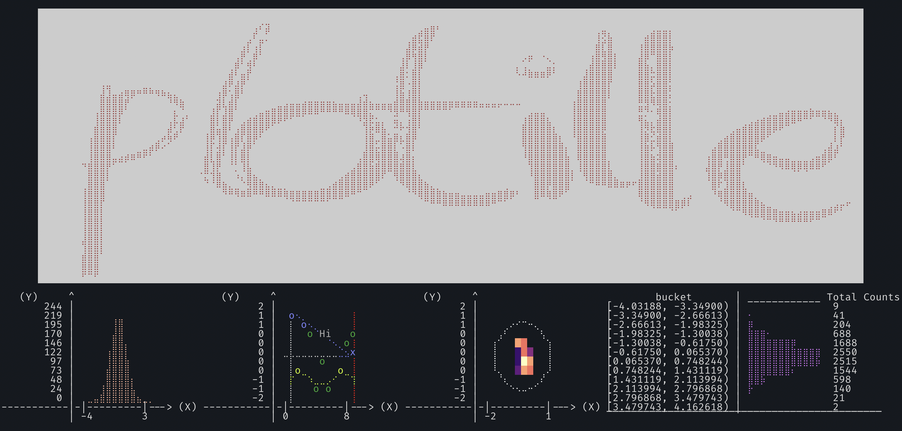 点字ドットと前景・背景色を用いて、外部依存なしにターミナルでグラフや散布図、ヒストグラム、ヒートマップを描けます。