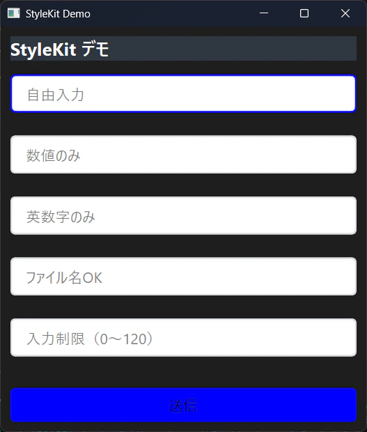 このサンプルは PySide6StyleKit の主要コンポーネントをまとめて確認できるデモウィンドウで、テーマ設定、スタイル付きラベル、入力制限付きテキストボックス、バリデーション処理などを一度に試せる構成になっています。