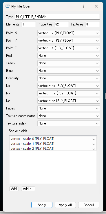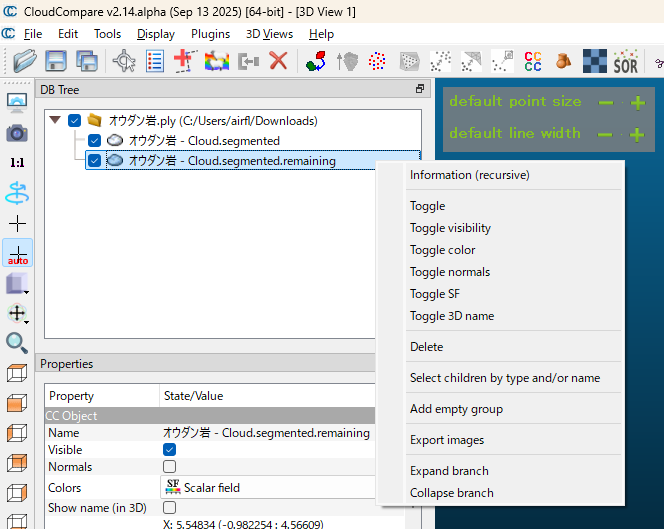 CloudCompareを開いたらFile > Open で保存したPLYを開きます。