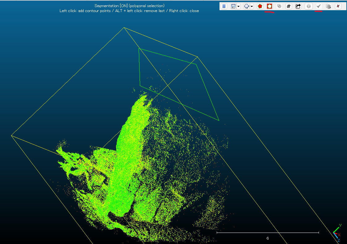 Edit > Segment を開き、不要な点群を左クリックしていき選択します。最後に右クリックして選択範囲を確定します。次に外が赤色の五角形”SegmentOut”をクリックし、チェックマークをクリックします。