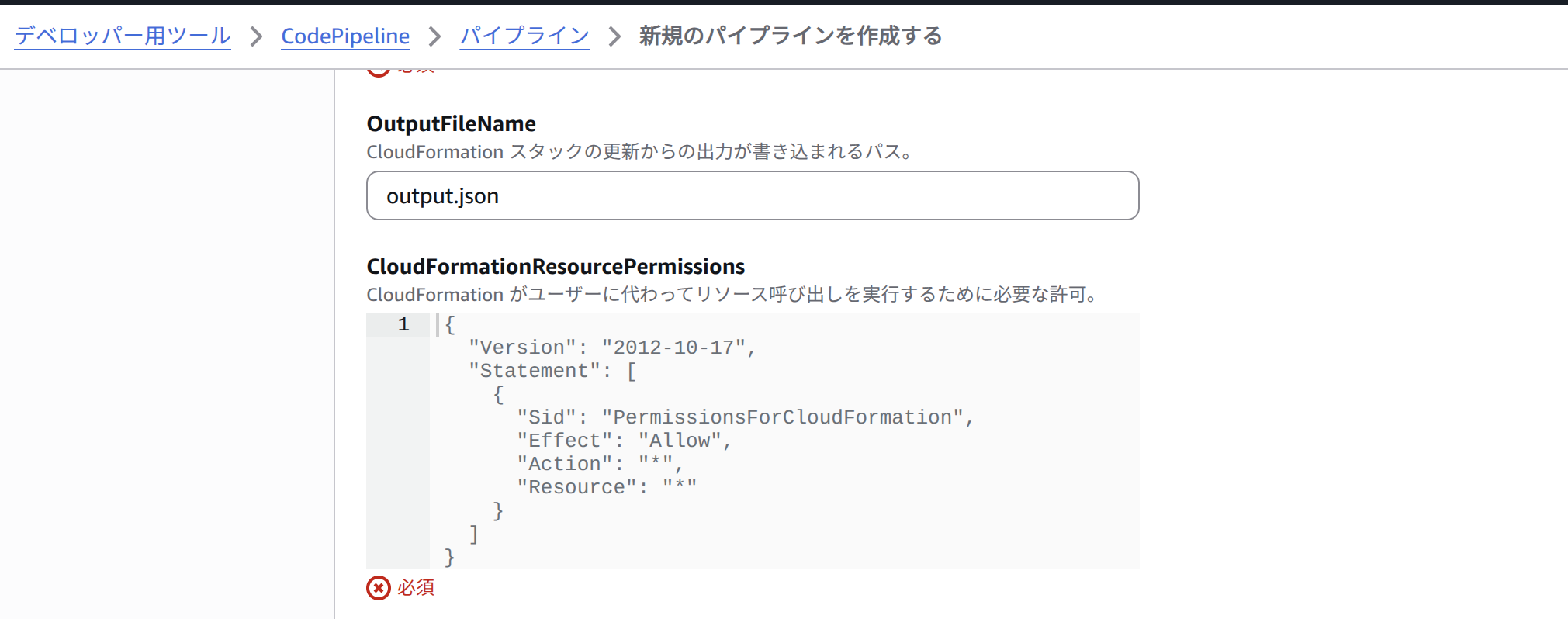 ↑ CodPpipeline作成時、ユーザーに代わってCloudFormationがリソースを作成するための許可の記載を求められる。