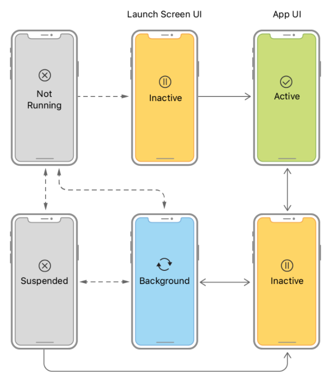 状態遷移図は下図の通りです。起動するときはInactiveを経由してからActiveになることや、ActiveからBackgroundになるときもInactiveを経由することが分かると思います。