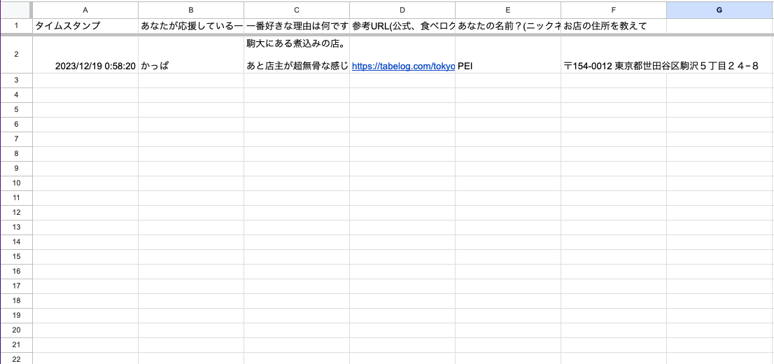 Glideはスプレットシートのデータを使えることもあり、回答がそのままスプレットシートで管理できるGoogle Formで回答フォームを作成しました!