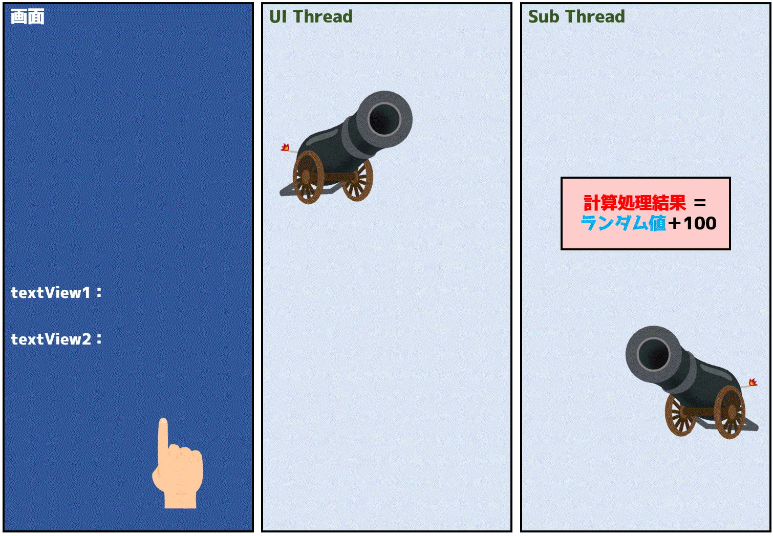 - UIスレッドで、受け取ったランダム値をtextView1に、計算結果をtextView2に表示します。