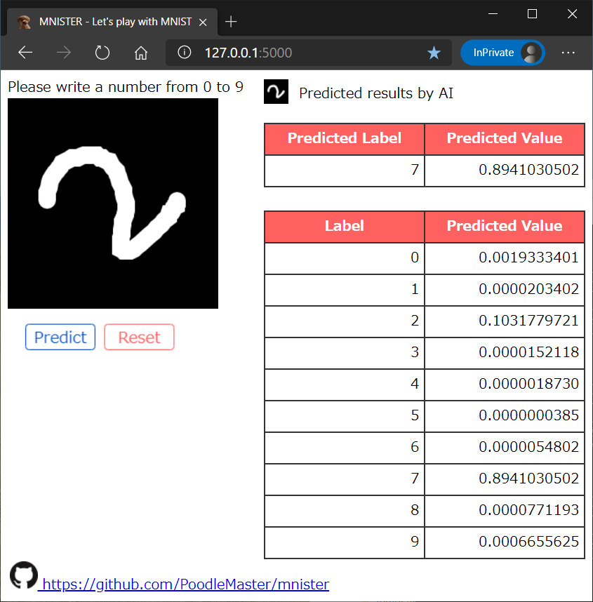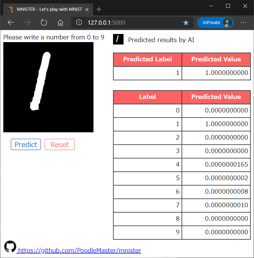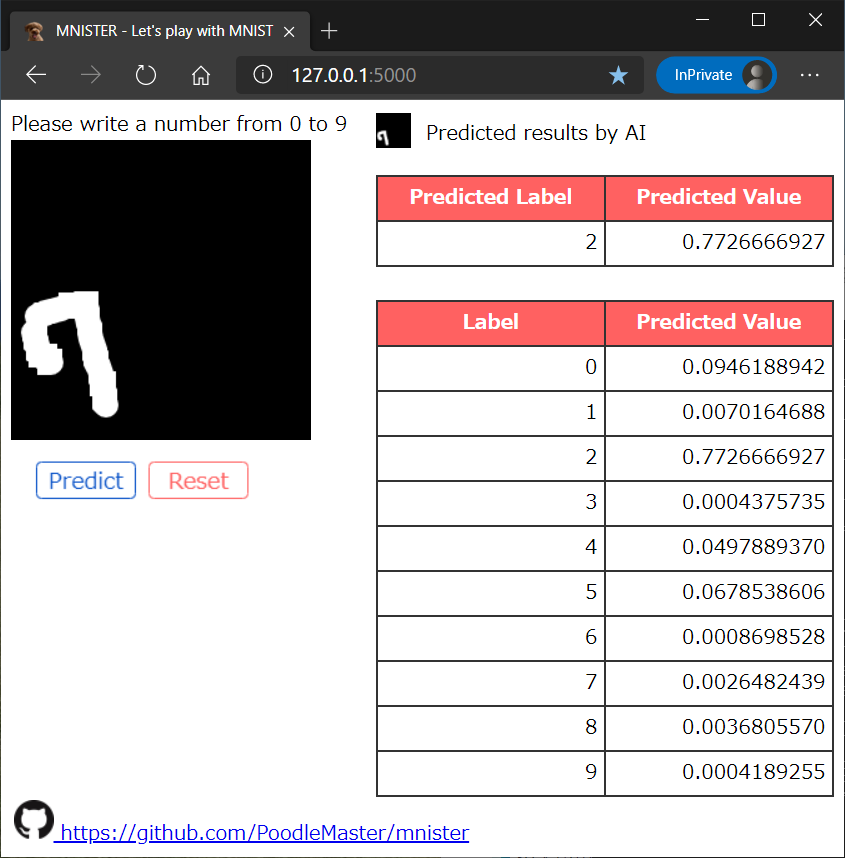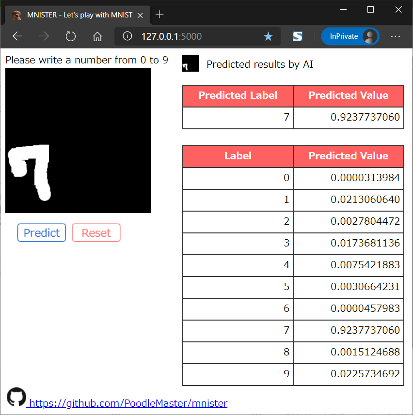 Browserで手書きの文字を入力できるツール(低認識のモデル付き)です。モデルを差し替えて遊んでください。こちらは『【MNIST】自分の数字をAIに認識させよう』の記事で公開しておりますので、よろしければご利用ください。ソースコードは、以下のGitHubで公開しております。