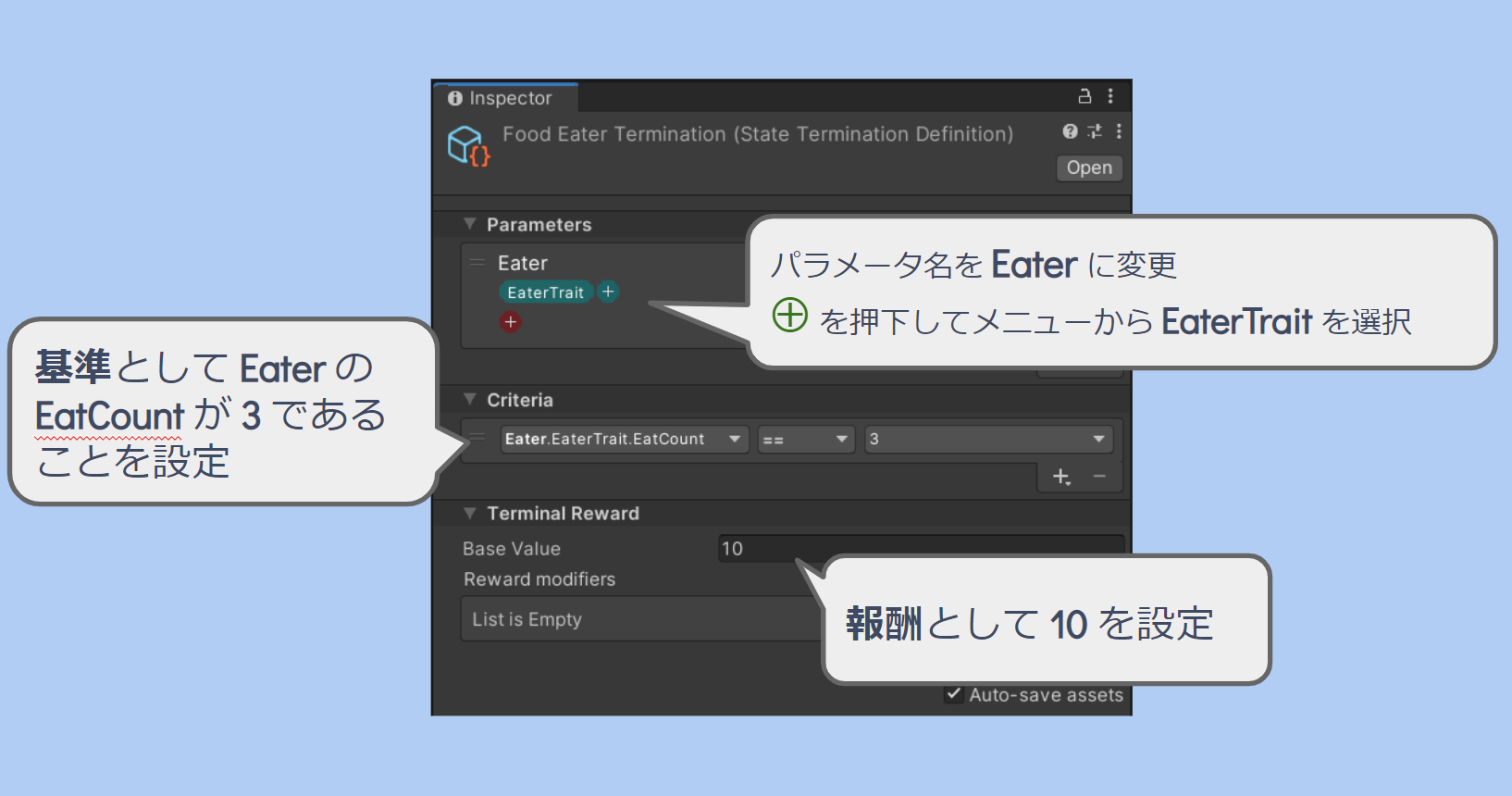 FoodEaterTerminationではEaterTraitに用意したプロパティ EatCount が3になったらという終了条件を設定しています。
