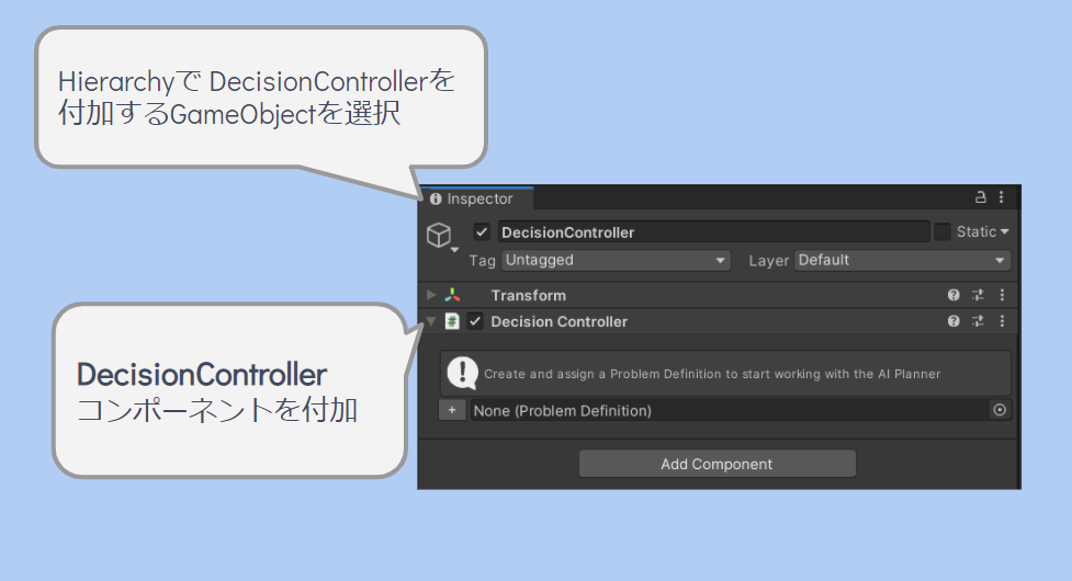 Decision ControllerはコンポーネントなのでGameObjectにAdd Componentして利用します。