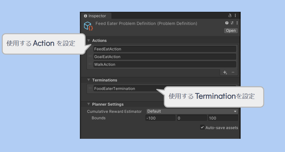 サンプルプロジェクトでは Problem Definition ファイル FoodEaterProblemDefinition を設定しており、FoodEaterProblemDefinition に設定した FeedEatAction、GoalEatAction、WalkAction が Available actions from the plan に設定されています。