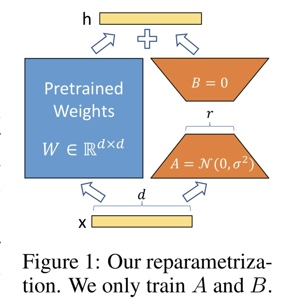 LoRA allows us to train some dense layers in a neural network indirectly by optimizing rank decomposition matrices of the dense layers’ change during adaptation instead, while keeping the pre-trained weights frozen, as shown in Figure 1.