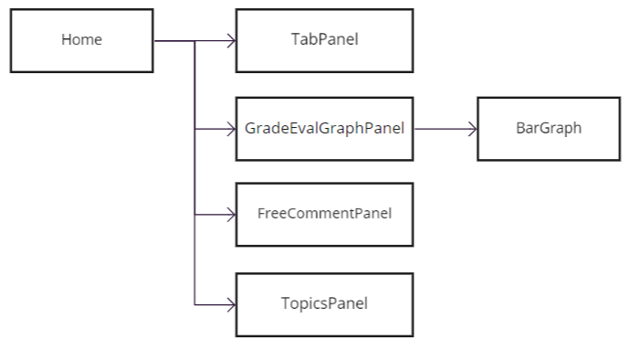 Homeコンポーネントはアンケート集計ページ全体を表していて、タブコンポーネントによって各パネルの表示状態を切り替えています。
