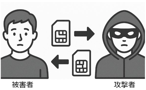 攻撃者がターゲット(被害者)の携帯電話番号を不正に取得し、ターゲットの電話番号を自分のSIMカードに移行させるという手法です。これにより、攻撃者はターゲットの携帯電話番号を使って、認証のコードを受け取ることができます。