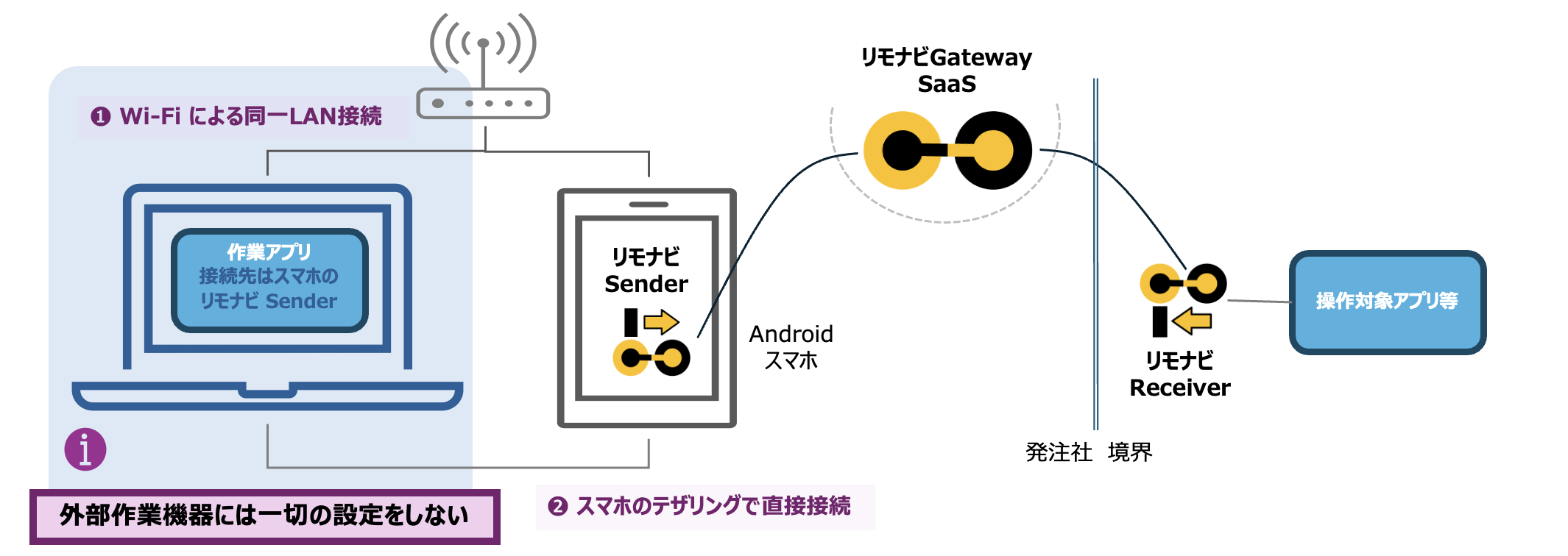 - これまでの RemoNavi は、お客様作業端末に ❶Sender インストールさせ、❷指示された設定を実施してもらって、❸接続してもらう、といったものでした。これにはリモナビSenderの利用とリモナビのAPI Tokenなどセキュリティ情報の公開が必要でした。