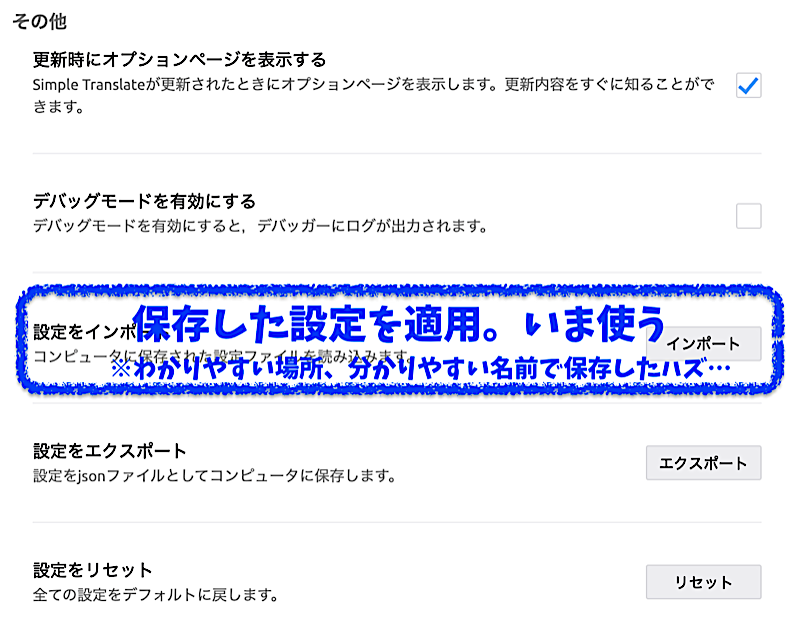 保存した設定ファイルを各ブラウザでの「Simple Translate」で読み込み&適用させる