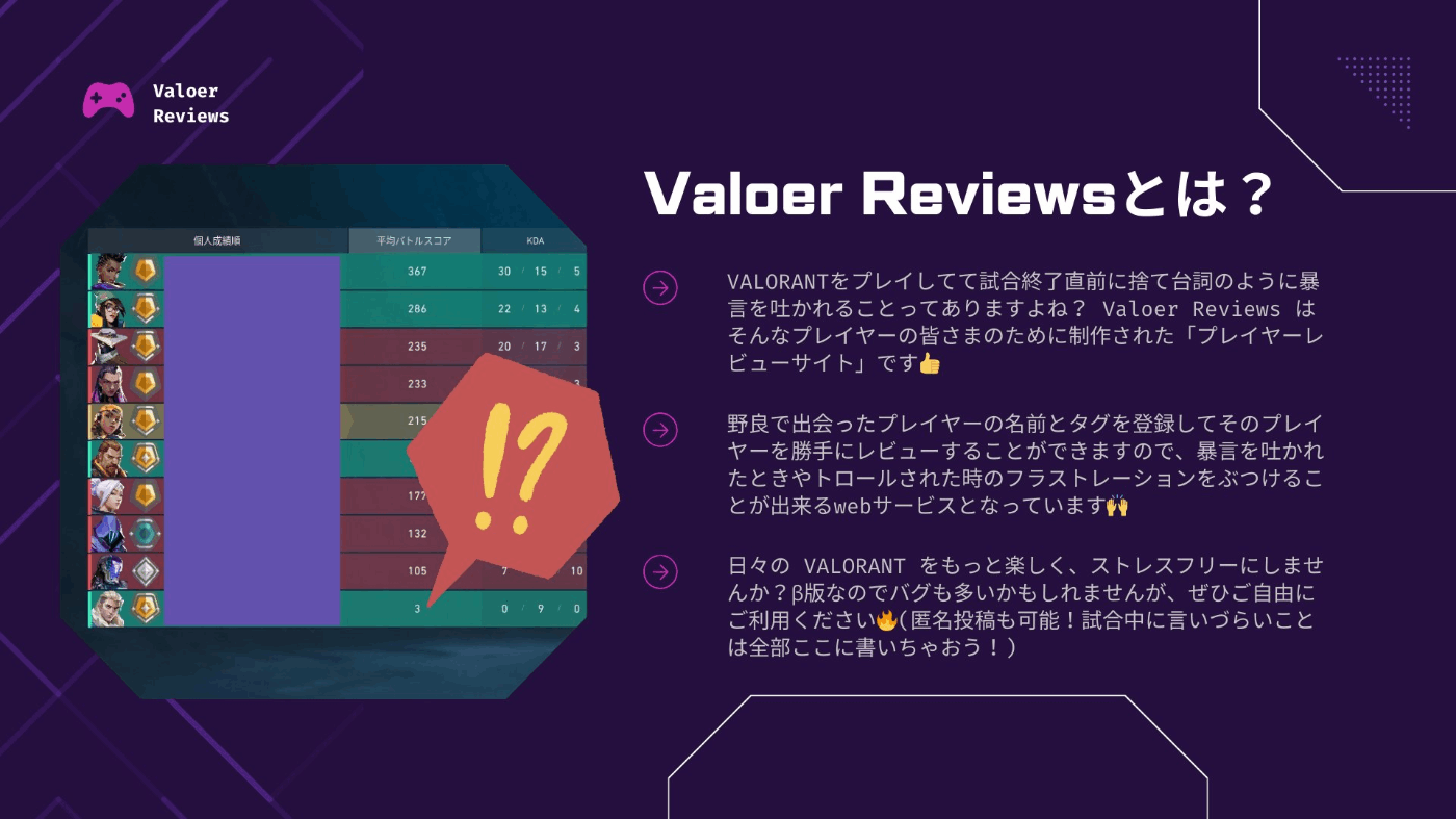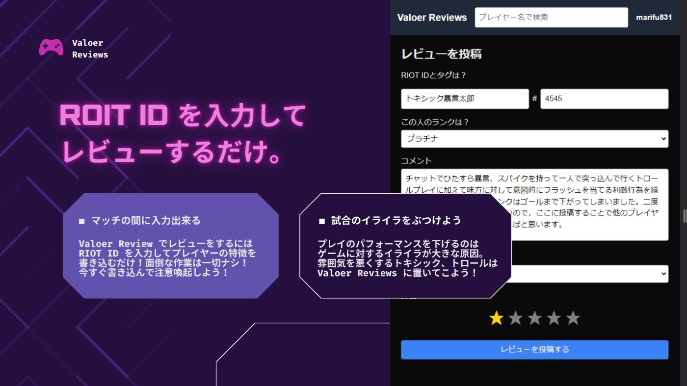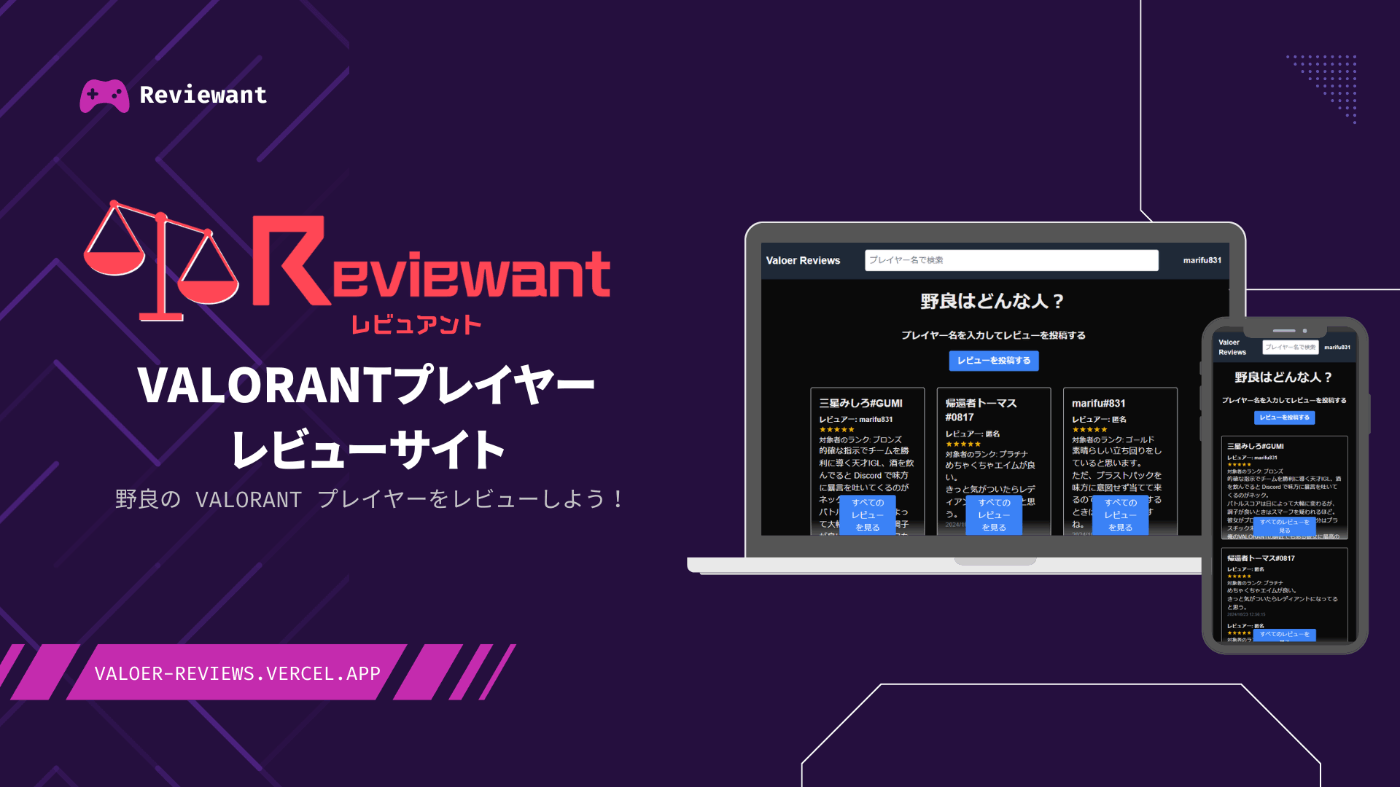 自分は趣味で VALORANT というゲームをやるのですが、このゲームのプレイヤーのマナーがとにかく酷い事が多く、自分が出会った害を為すプレイヤーを共有して被害者を増やさない仕組みを作りたいと思い、今回「Reviewant」という名前でβ版としてリリースをしました!