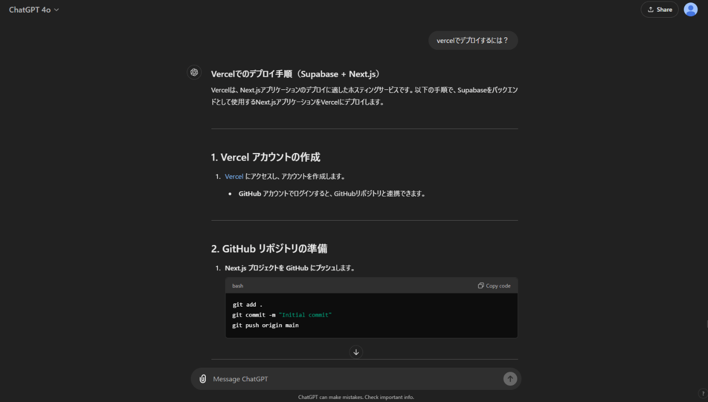 例えば、ChatGPTでコード生成 → GitHubにプッシュ → CI/CDで自動デプロイのように一連の流れを組み上げれば、ミスのないスムーズなリリースが可能になります。