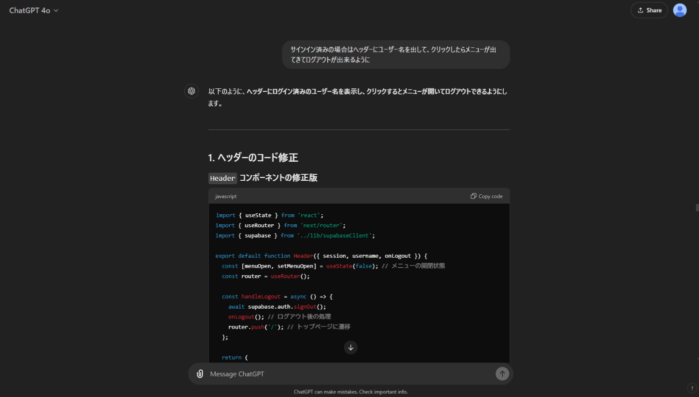 以下にて、自分から入力したプロンプトをすべて置いておきますので、もしなにかの参考になればと思います。(AIの回答や自分が貼り付けたソースコードは流石に記載しきれないので割愛しています)