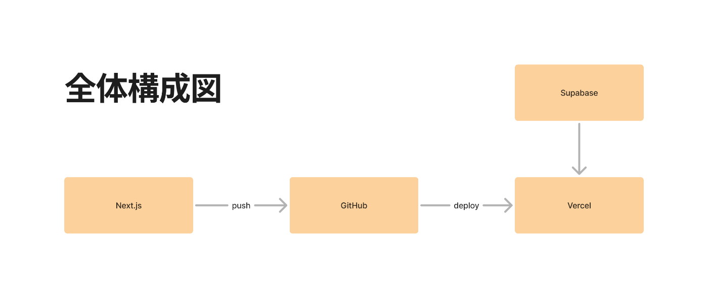 構成はなるべくシンプルに、バックエンドに時間を掛けないよう Supabase と Vercel を活用しました。