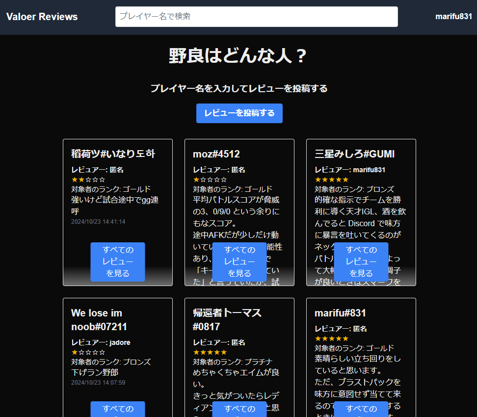 トップページには実際にレビューされたプレイヤーとレビューの一覧が表示されています。