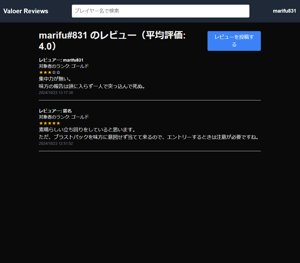 また、それぞれのプレイヤーごとのレビュー一覧の画面も作成しました。ユーザーごとにレビューの平均評価も表示するようになっています。