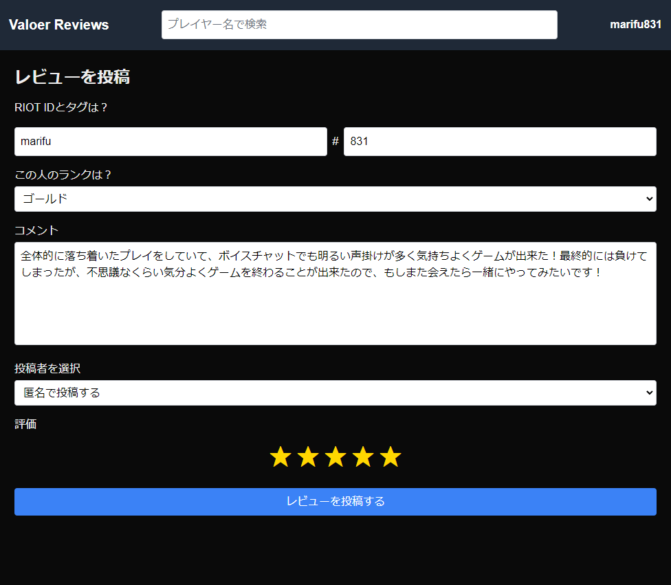 こちらはレビュー投稿画面で、RIOT IDとタグを入力して特定の人をレビューすることができます。対象プレイヤーがまだレビューを書かれていなければレビューと共にプレイヤーが新規に登録され、すでにレビューされているプレイヤーの場合はレビューのみ追加される実装となっています。また、ユーザーは自分のユーザー名か匿名か選択した上で投稿することも可能です。