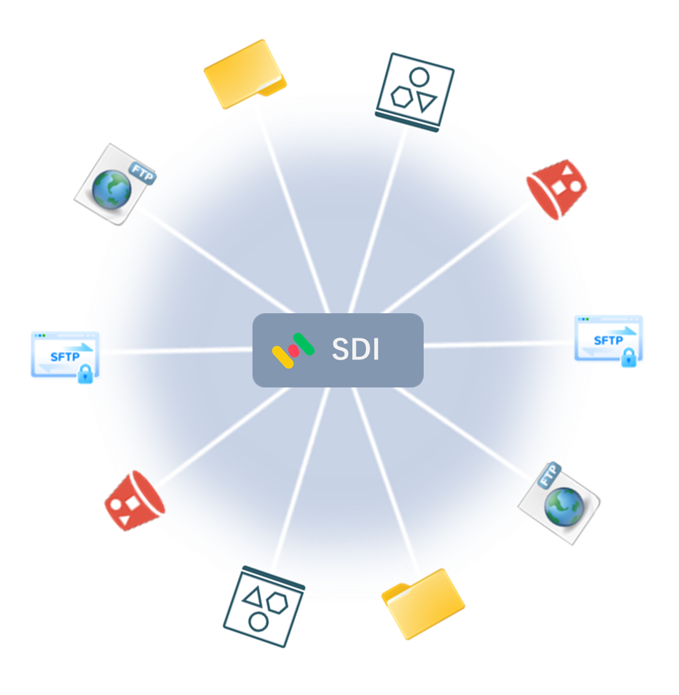 Simple Data Integrator(SDI)を使用すると、ローカル、FTP、SFTP、クラウドストレージ間の任意の2拠点間でファイル転送が可能です。