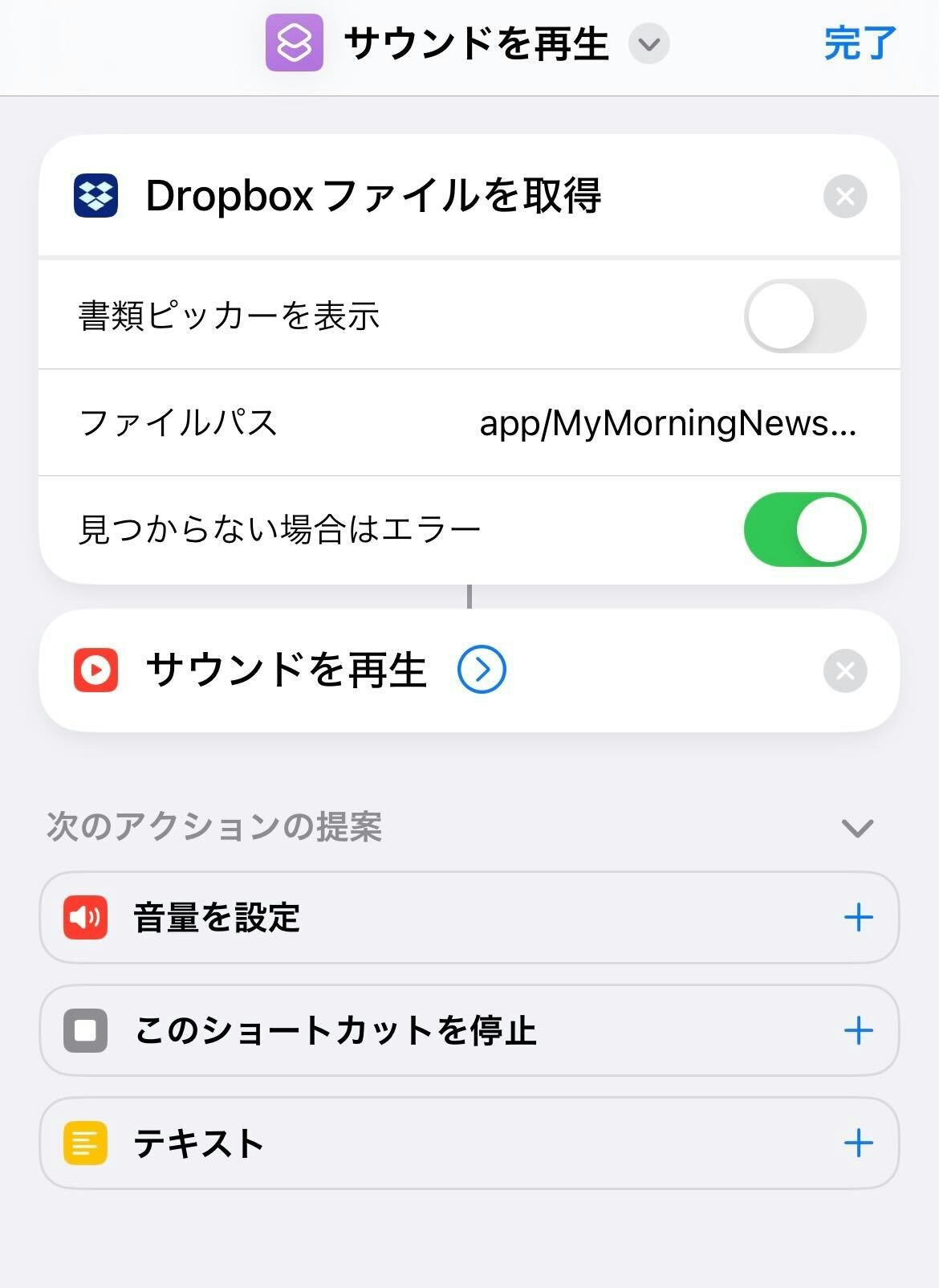 このショートカットを個人用オートメーションで「朝8時になったら実行」のようにスケジューリングしておけば、時間になると自動でDropboxから最新の音声ニュースを取得して再生してくれます。今回はDropboxを介しましたが、iCloudドライブへ出力するようにしてショートカットから読み上げても同様のことが可能です。