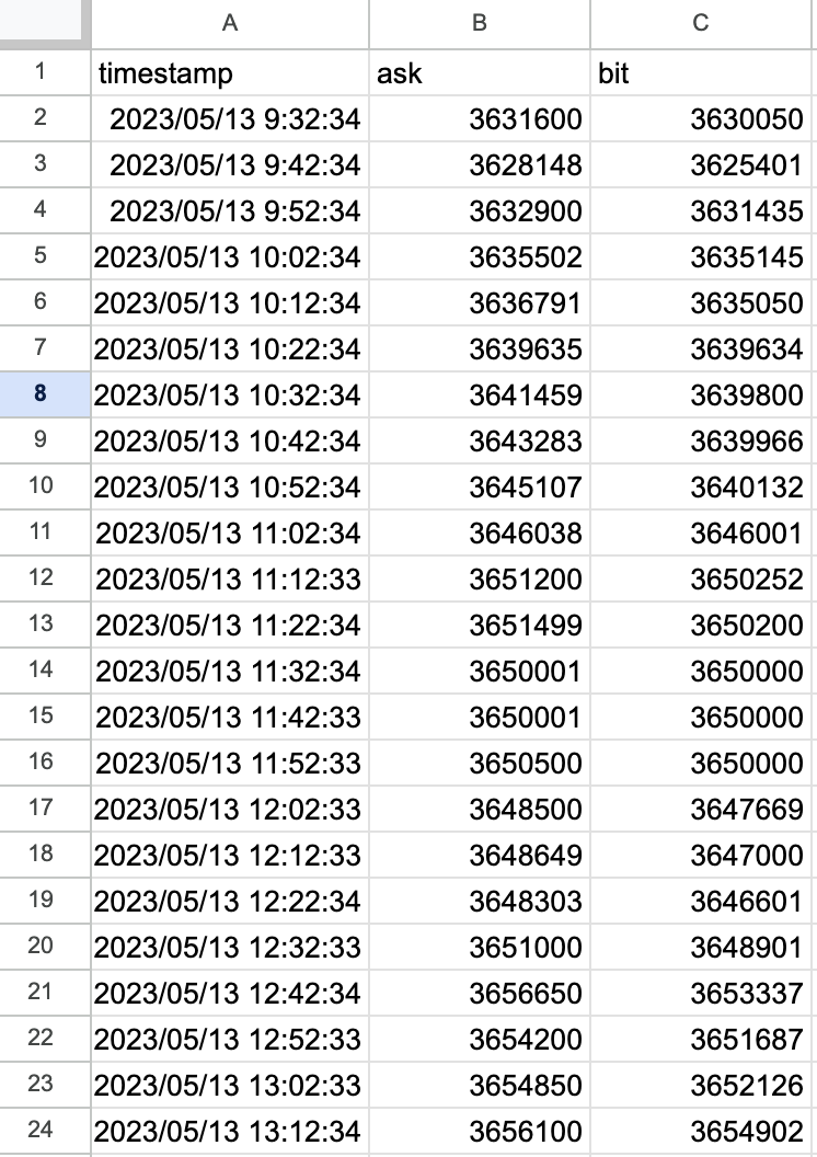 GMOコインAPIでは過去のレートが取得できなかったので、Googleスプレッドシートに書き込みに行っていますが過去のレートをAPIから取得できれば更に実装が楽になりそうですね。(PrivateAPIでも取れなさそうでした)