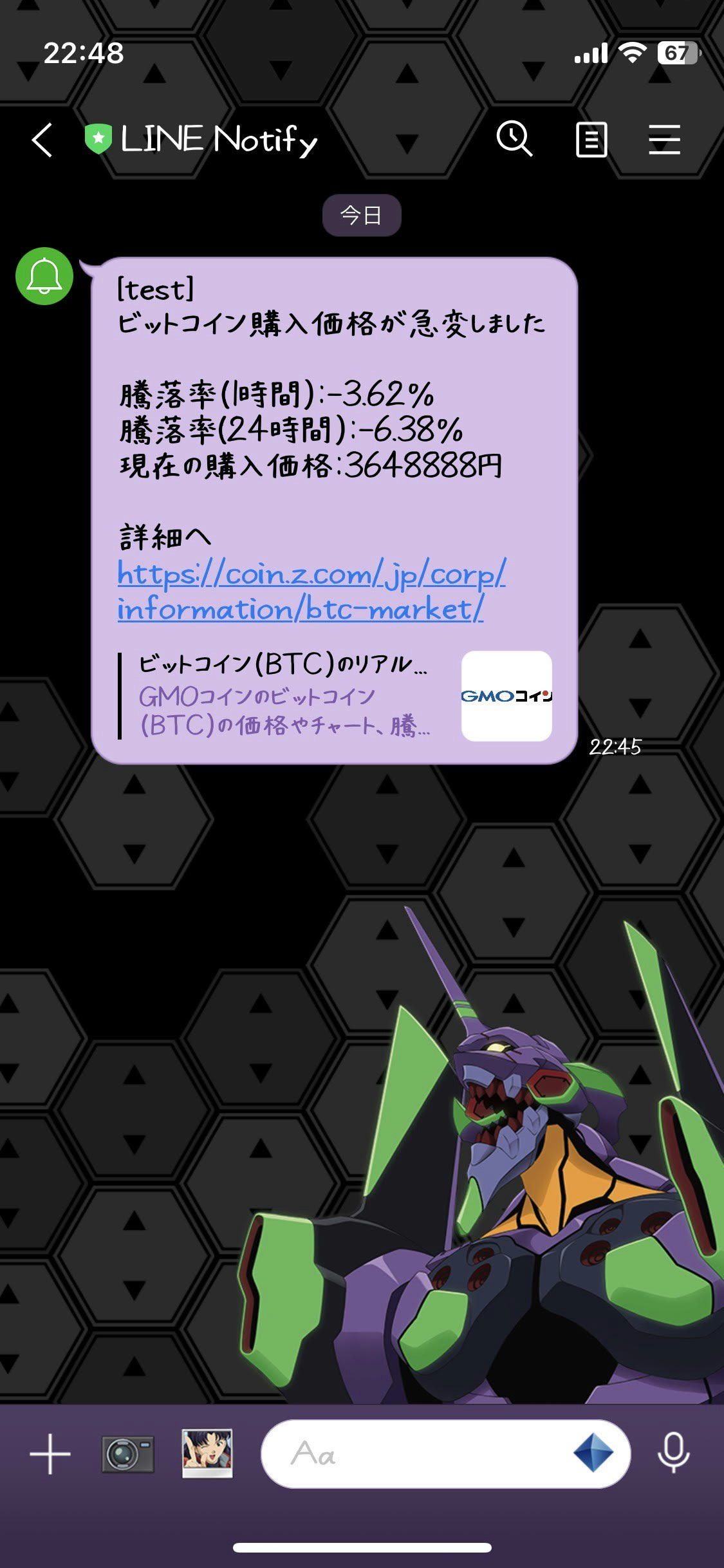 定期的にビットコイン価格を自動チェックして騰落率が閾値を超えるとLINEでメッセージが送られます。