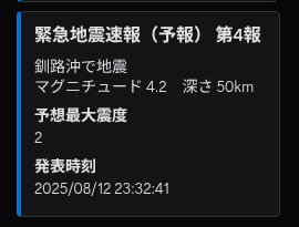 一見まともなように見えるかもしれませんが、実際は深さ ごく浅いが深さ -1kmになったり、そもそも深発地震や単独点処理などで最大震度が予測されないときはクラッシュしたりするなど、問題だらけでした。