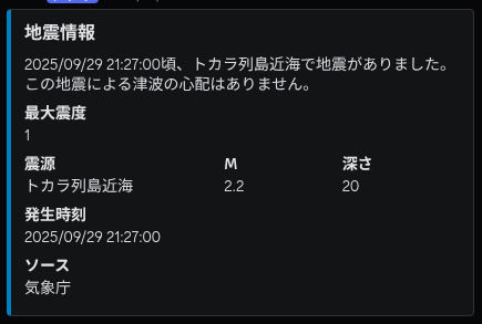 こちらの試験的に導入してみた地震情報Botも、深さに単位がつかないわ、秒が全部:00になるわで改良の余地だらけでしたね。