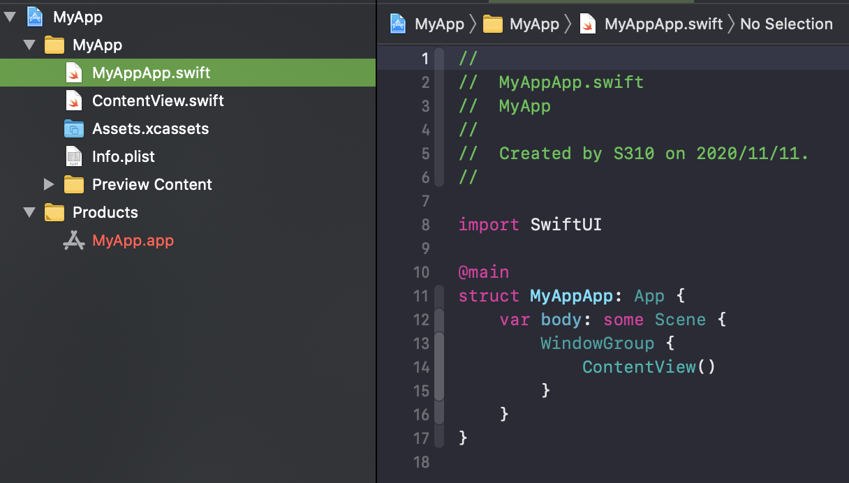 いつもの君たちはいない。。「アプリ名App.swift」がいる。。