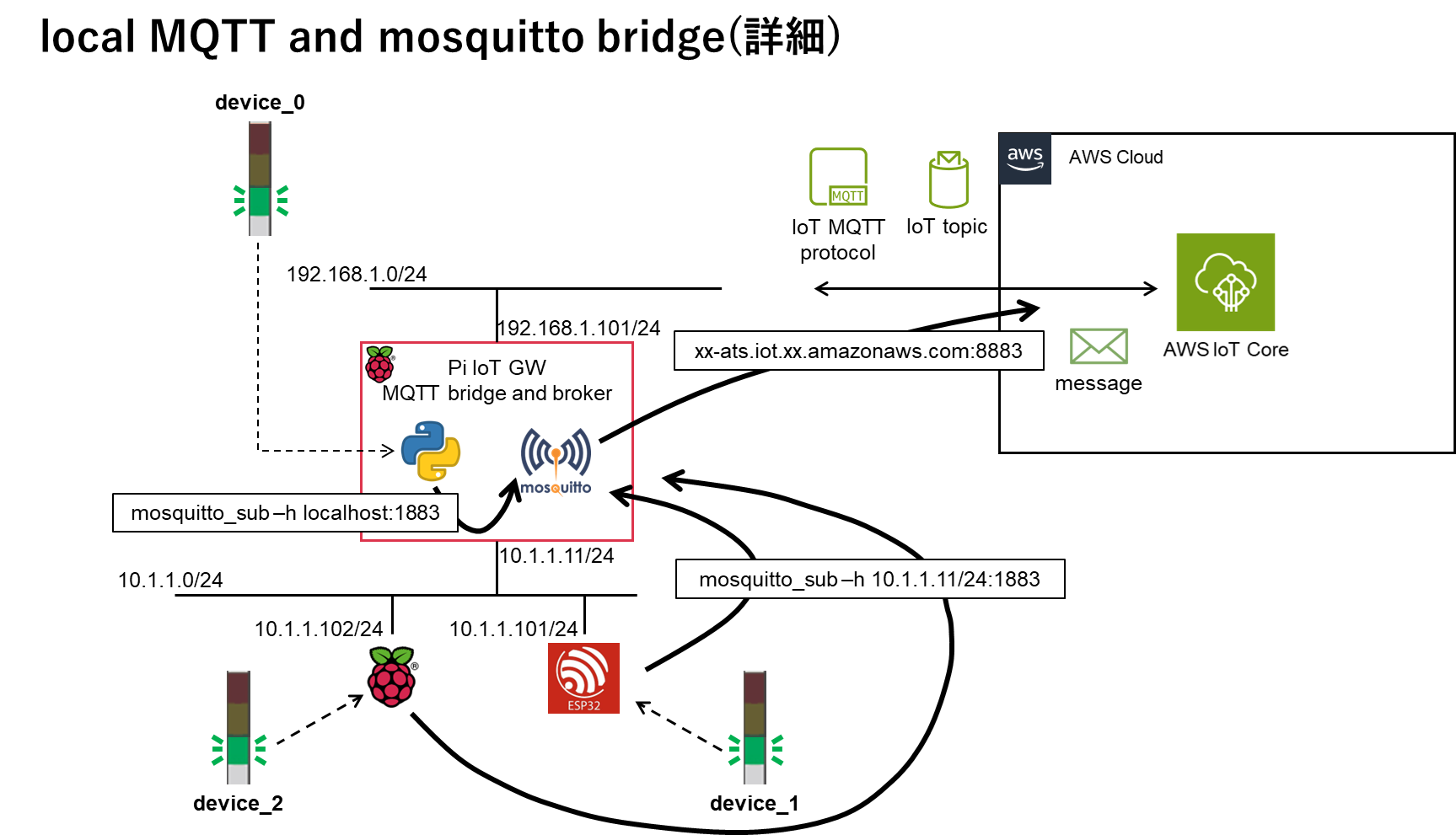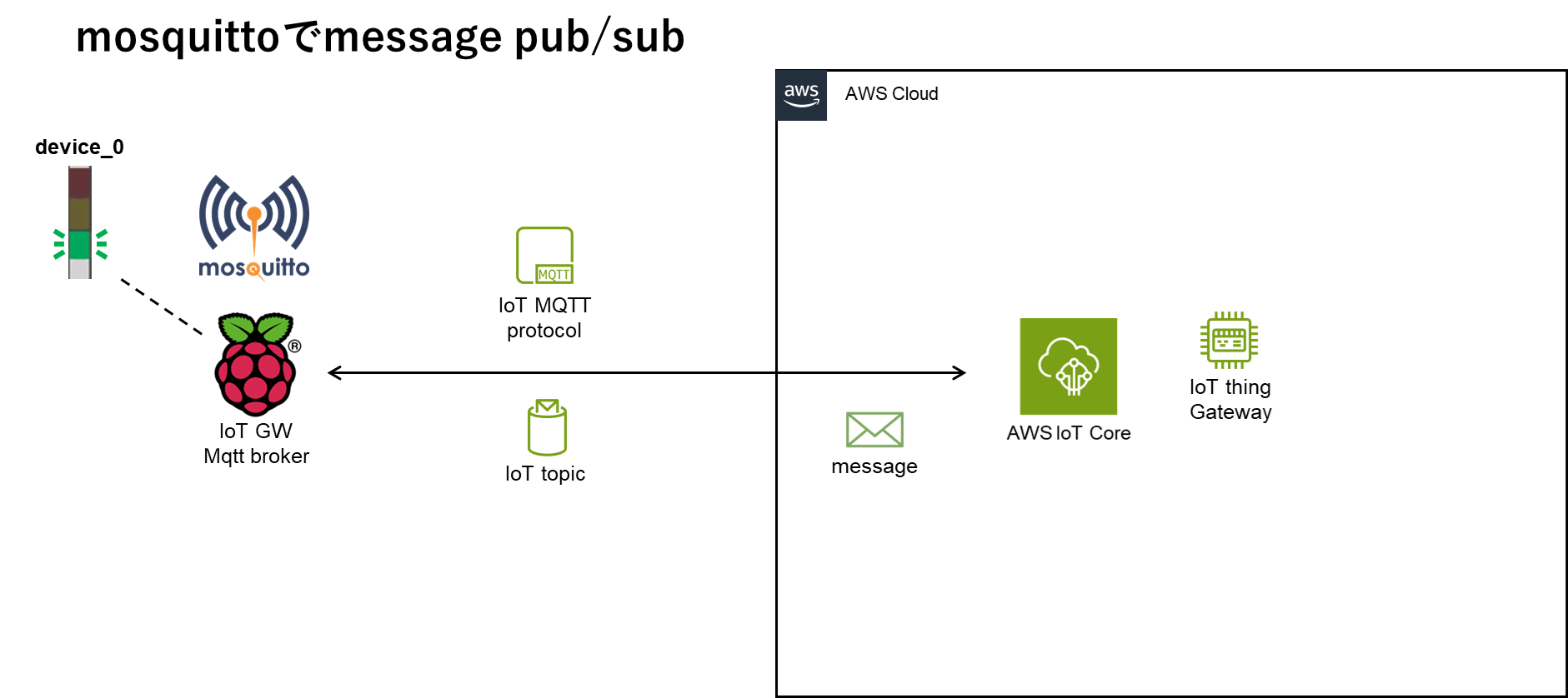 shadowとwillとretainを活用してAWS IoT CoreとPubSubする②AWSリソースの構築で構築した環境を使ったラズパイGW broker <-> AWS IoT間でのMQTT通信、ここから3回はmosquittoでmessageのpubsub、shadowのupdate/get、retainとwillの設定をします。