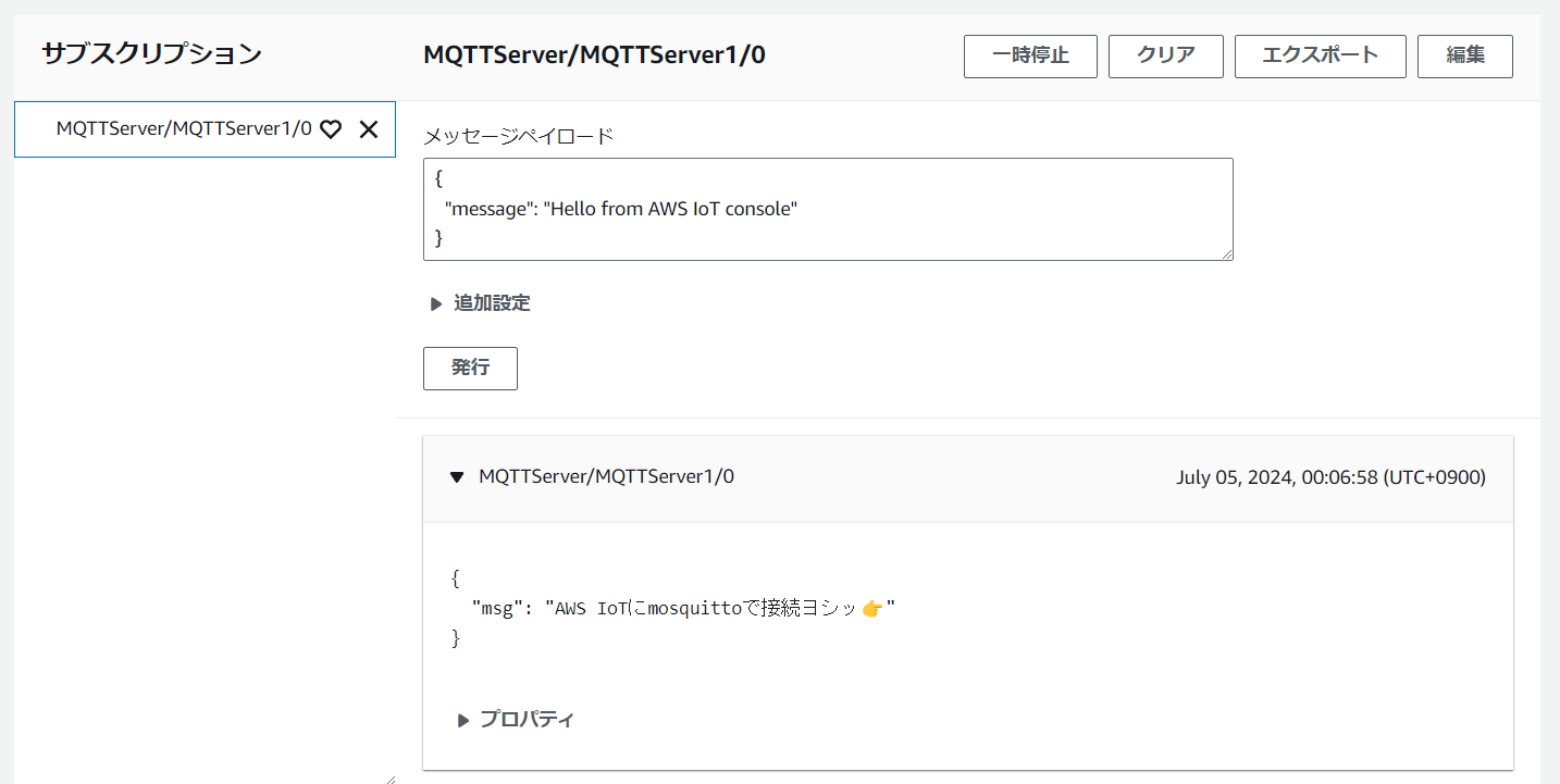 MQTTServer/MQTTServer1/0 {"msg": "AWS IoTにmosquittoで接続ヨシッ👉"}