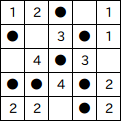 下図の白いマスに爆弾が隠れています(下図は答えなので爆弾(●)が見えています)。