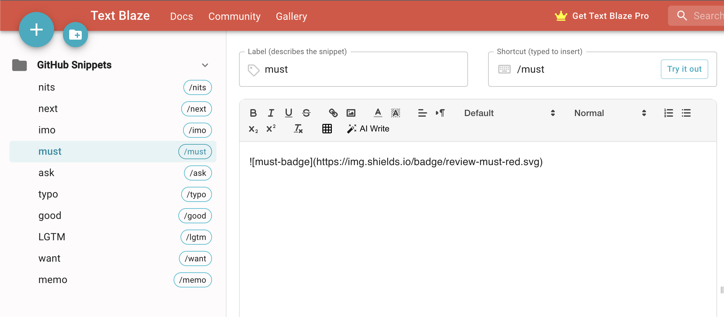そこで Text Blaze をつかって、コードスニペット化させよう