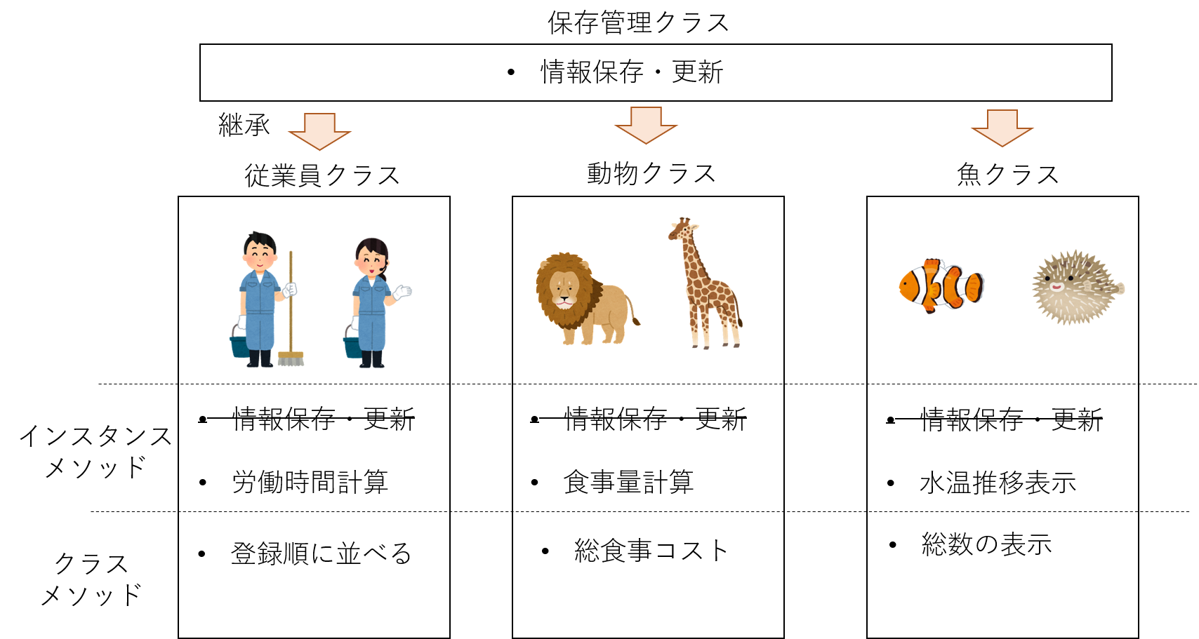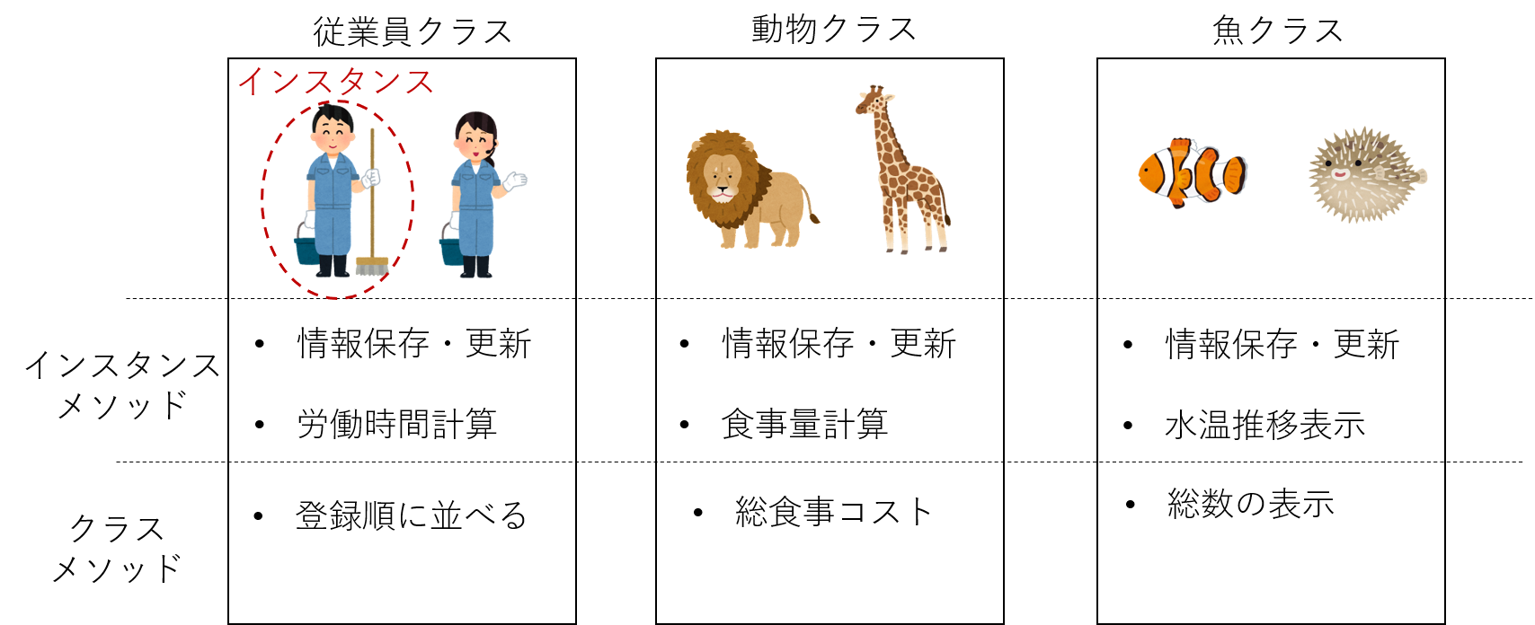 例えば、動物も魚もいる動物園のアプリケーションがあった際には以下のように、まとまりごとにクラスを作成します!その中で一つのオブジェクト(データ)をインスタンスと呼びます。