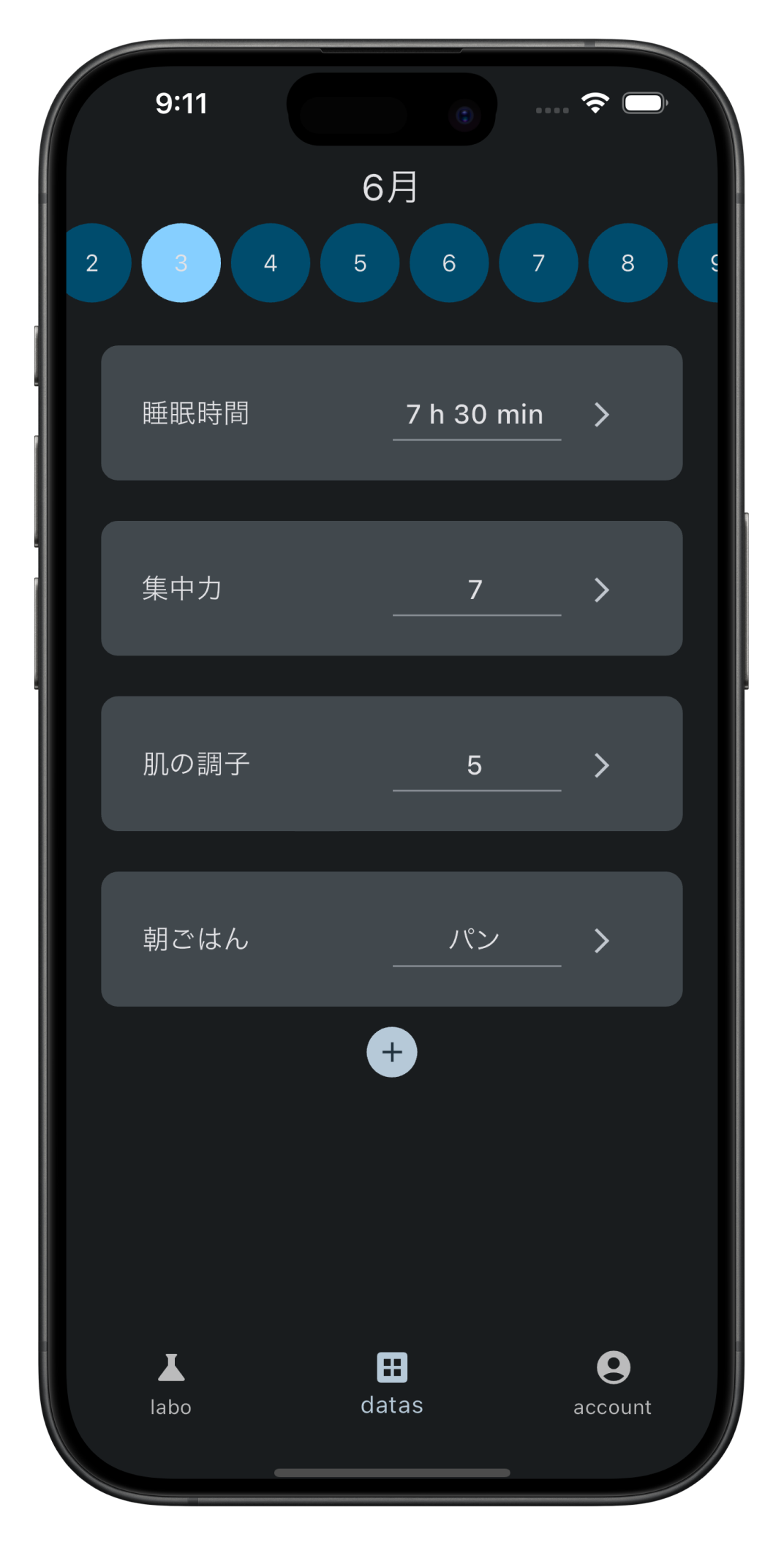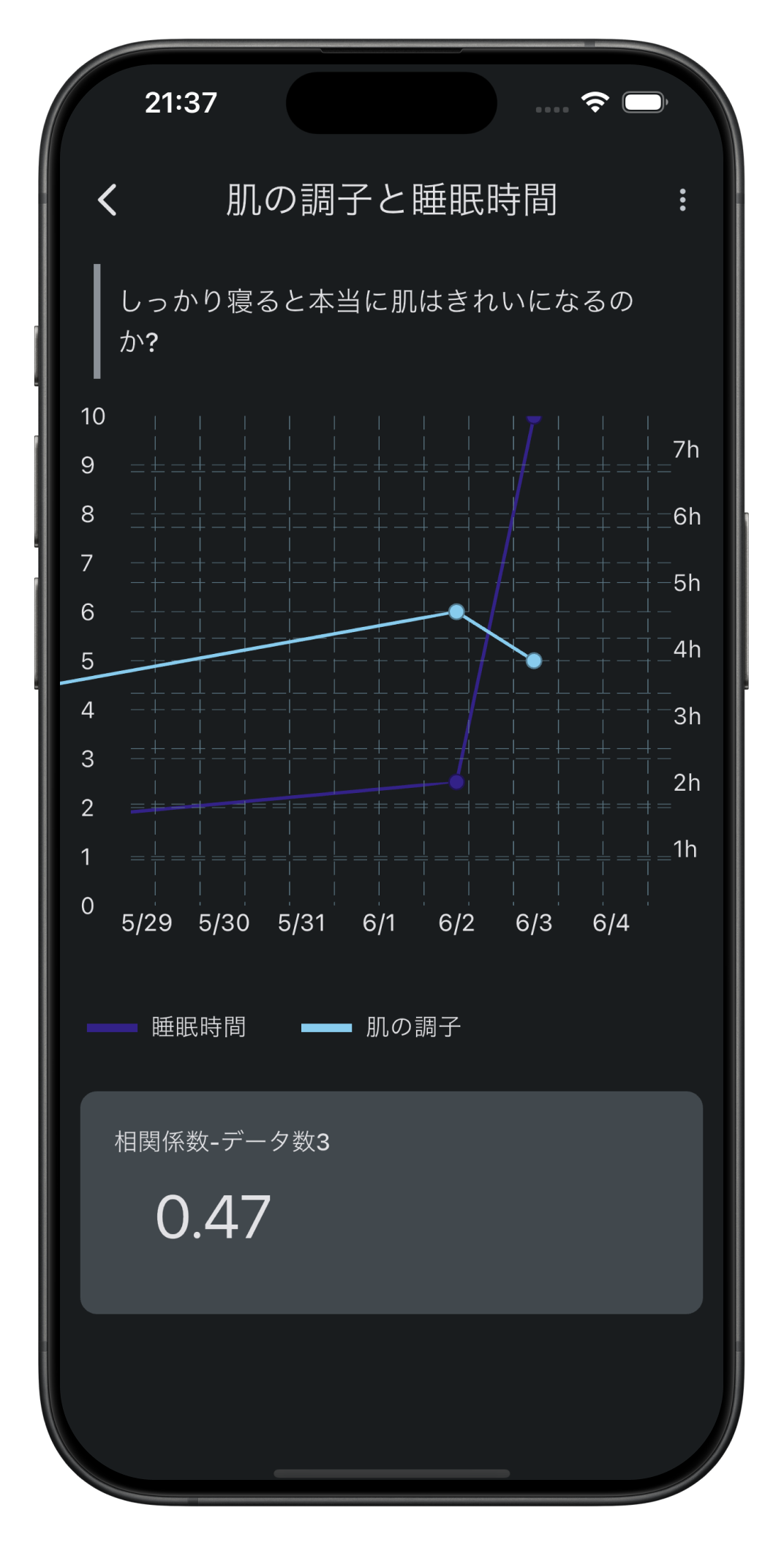 「睡眠時間」「肌の調子」の2データを独立に入力していき、