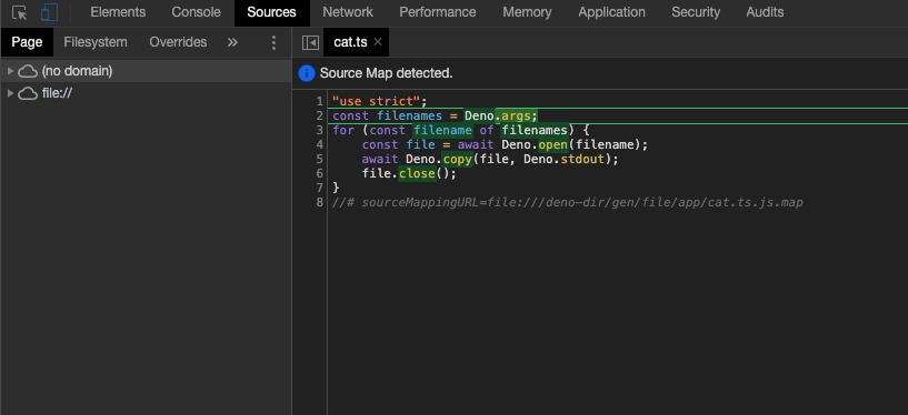 $ docker run --rm -it --init -p 9229:9229 -v $PWD:/app hayd/alpine-deno run --inspect-brk=0.0.0.0:9229 --allow-read /app/cat.ts /app/sample.txt