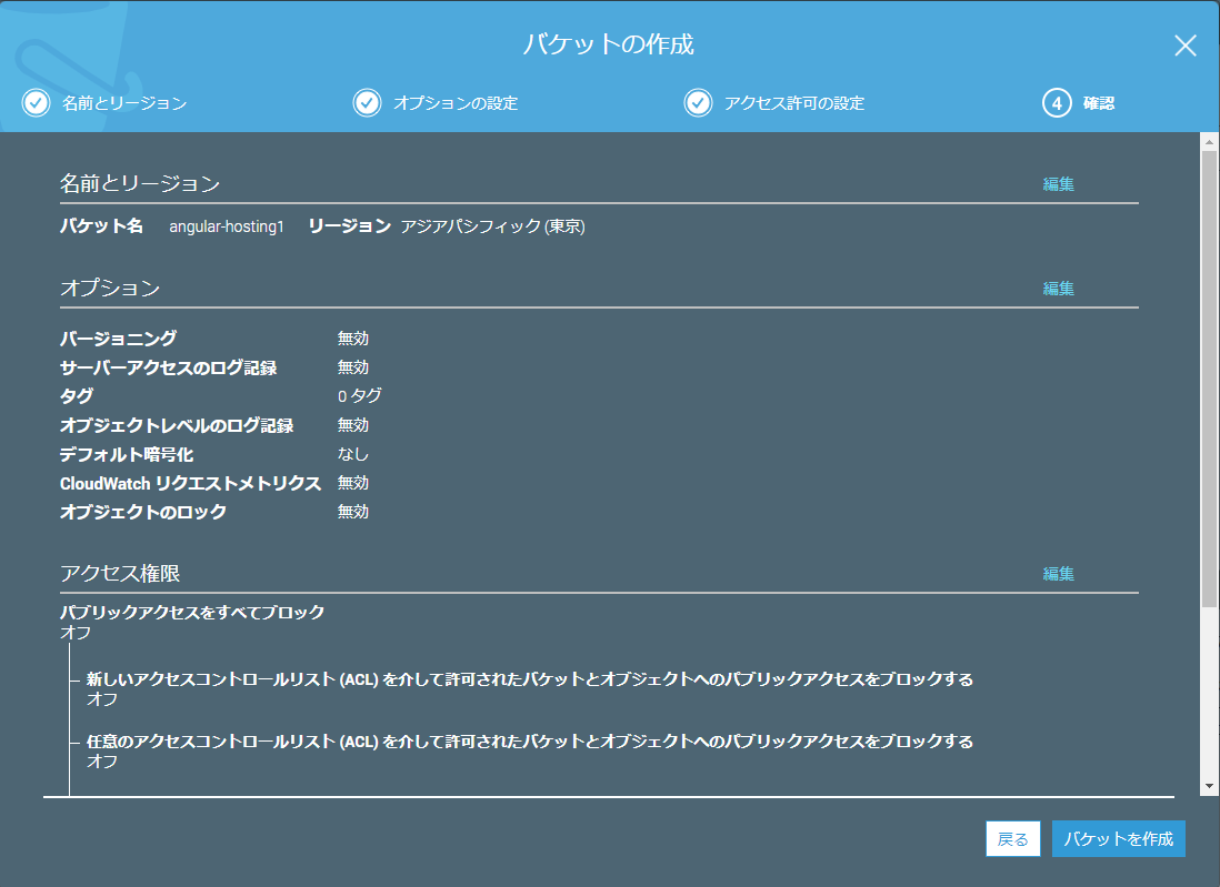 確認画面が表示されるので「バケットを作成」を押下するとバケットが作られます。