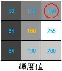 上記の画像のように3x3の輝度値を昇順に並び替えるとします.上記の輝度値(枠の中の数字)を並び替えたら64,64,80,128,150,160,190,200,255になります.数字は合計で9個あります.奇数なので中央値は150になります.そのため,メディアンフィルタの結果は150と変換されます.