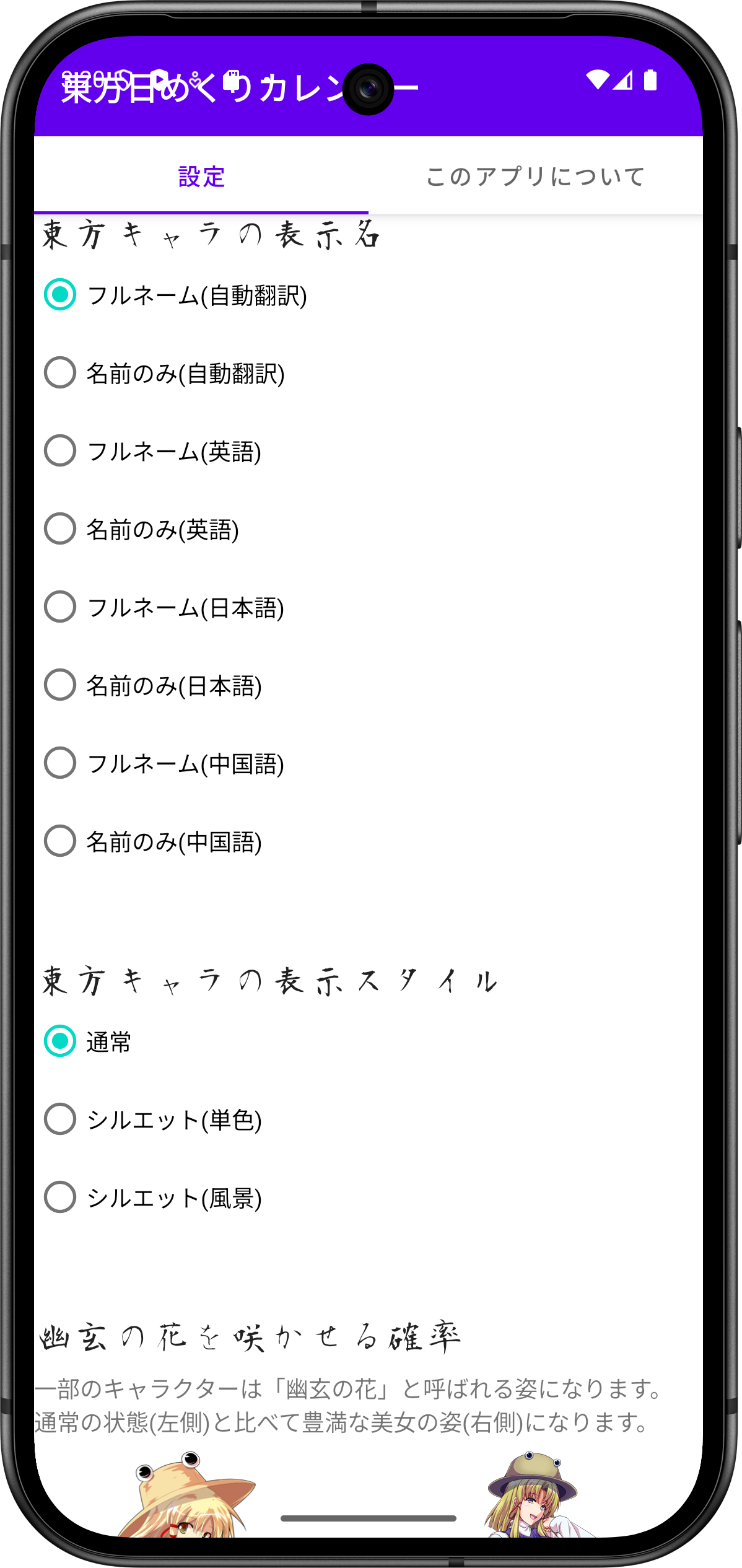 - 特定の日付は東方記念日に制定されており、対応するキャラの立ち絵が表示されます。