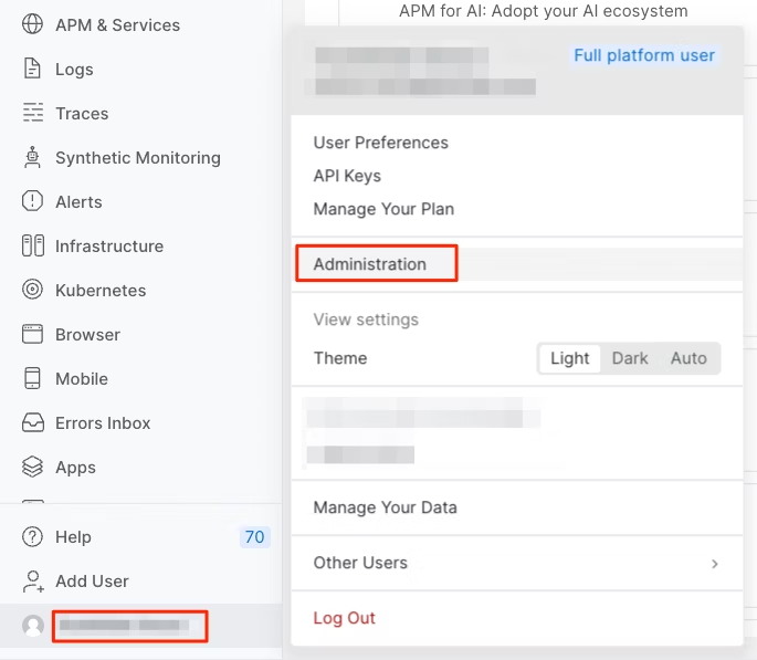 はじめにブラウザでNew Relicにログインして、左下のユーザーアイコンからAdministrationを開きます。
