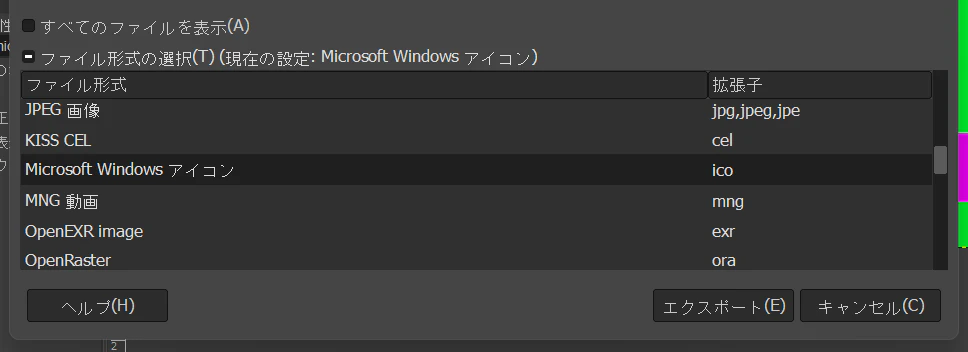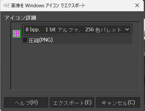 完成したらファイルの名前を"icon.ico"、場所を指定してエクスポートをクリック。