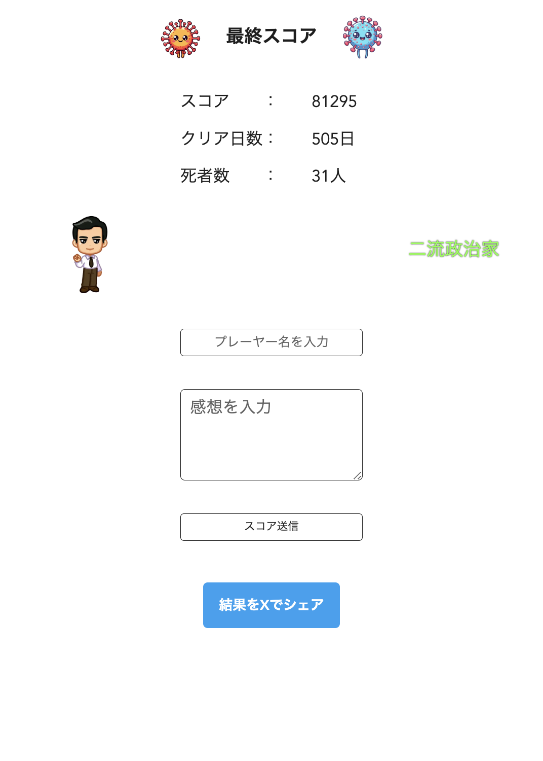 パラメータ調整は最も難易度の高いタスクの一つで、ウイルスの強さや政策の強さ、初期値など変数がものすごい量あった中で、ハイスコアを取るのが一定以上の難易度になる、かつプレイングの内容がスコアに反映されやすいように調整するのは本当に大変でした。色々なパラメータで試遊してくれたメンバーには大感謝です。ゲームの難易度調整は本当に大変かつ重要で、ポケモンなどのゲームの調整の素晴らしさを身にしみて体験することができました。