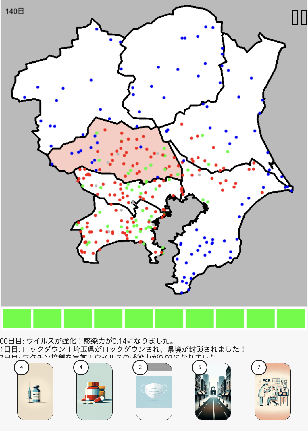 画像のように人間を一つの点として接触感染をシミュレーションし、プレイヤーは政治家として政策をアイテムとして使い、一刻も早い感染の収束を目指すゲームになります。